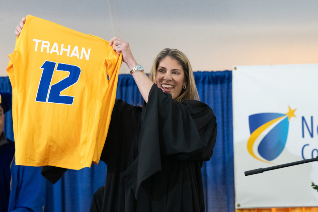 Following her remarks, President Glenn presented Rep. Trahan with her very own custom NECC volleyball jersey. Trahan was a standout volleyball player at Lowell High School. She earned a scholarship to play at Georgetown University, where she became the first in her family to attend college.