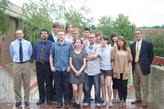Vice President of Academic Affairs Bill Heineman, Professor Tom Greene, and President Lane Glenn pose with Polish Students.