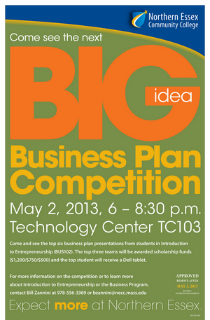 Competing for more than $2,000 in scholarship money and a Dell laptop computer, students in Northern Essex Community College’s Introduction to Entrepreneurship course will present their business plans at the college’s 4th Annual Business Plan Competition. The event is scheduled for Thursday, May 2 from 6 to 8:30 p.m. in NECC’s Technology Center, 100 Elliott St., in Haverhill, and is open to the public.
