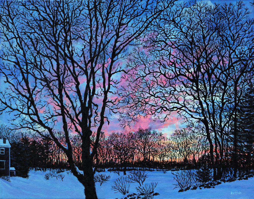 “Winter Sunset” by Haverhill artist and Whittier’s Birthplace caretaker Mark Reusch