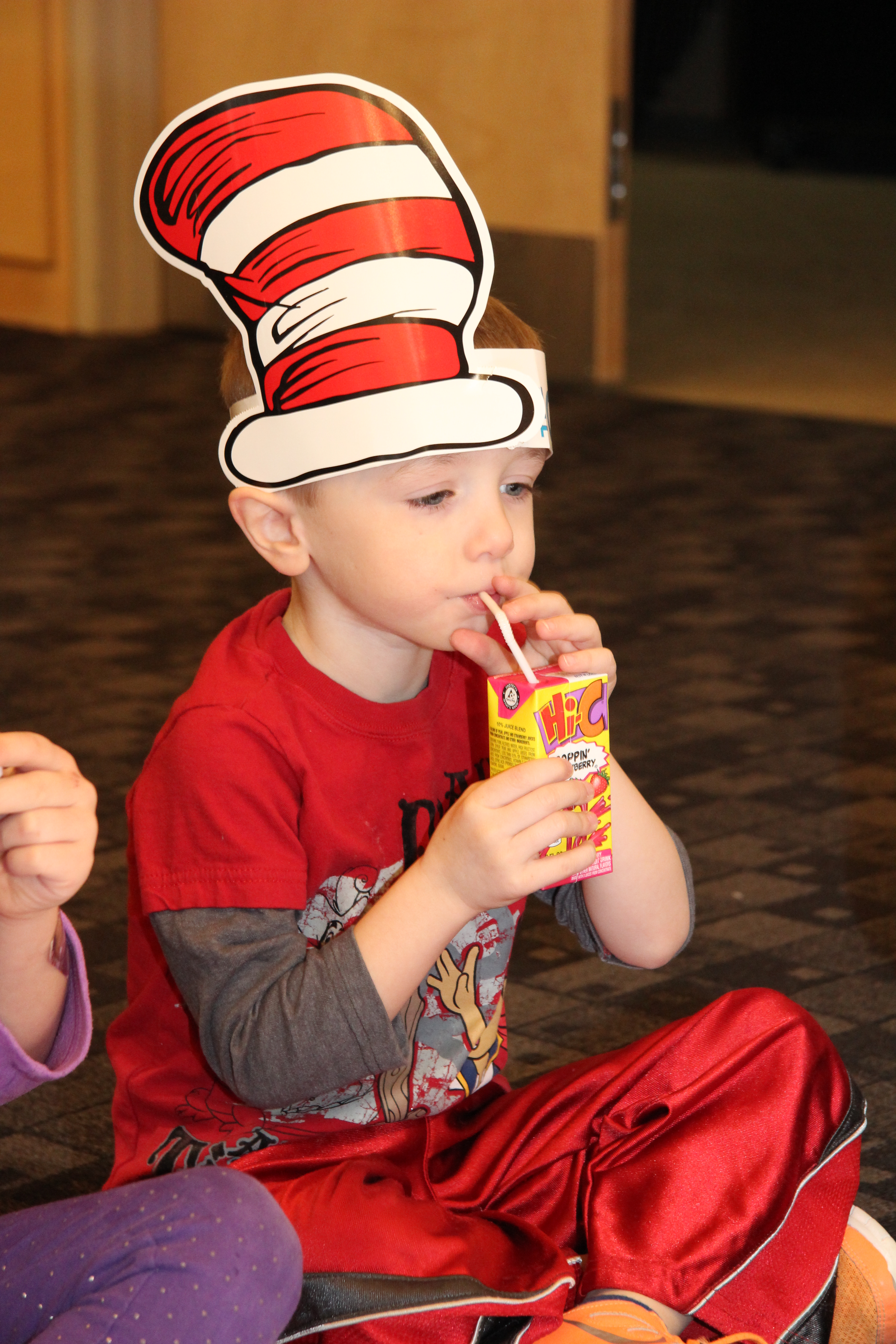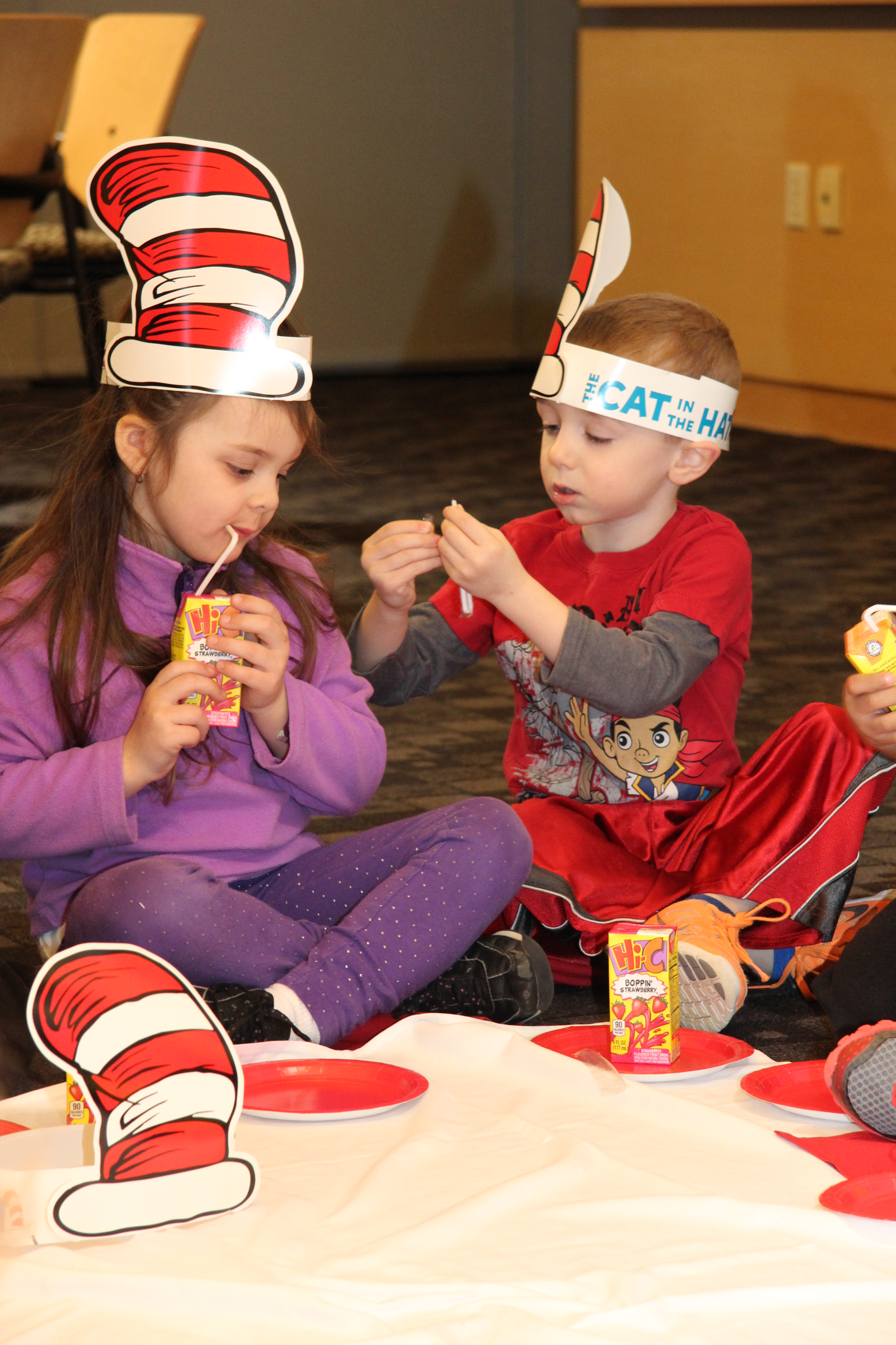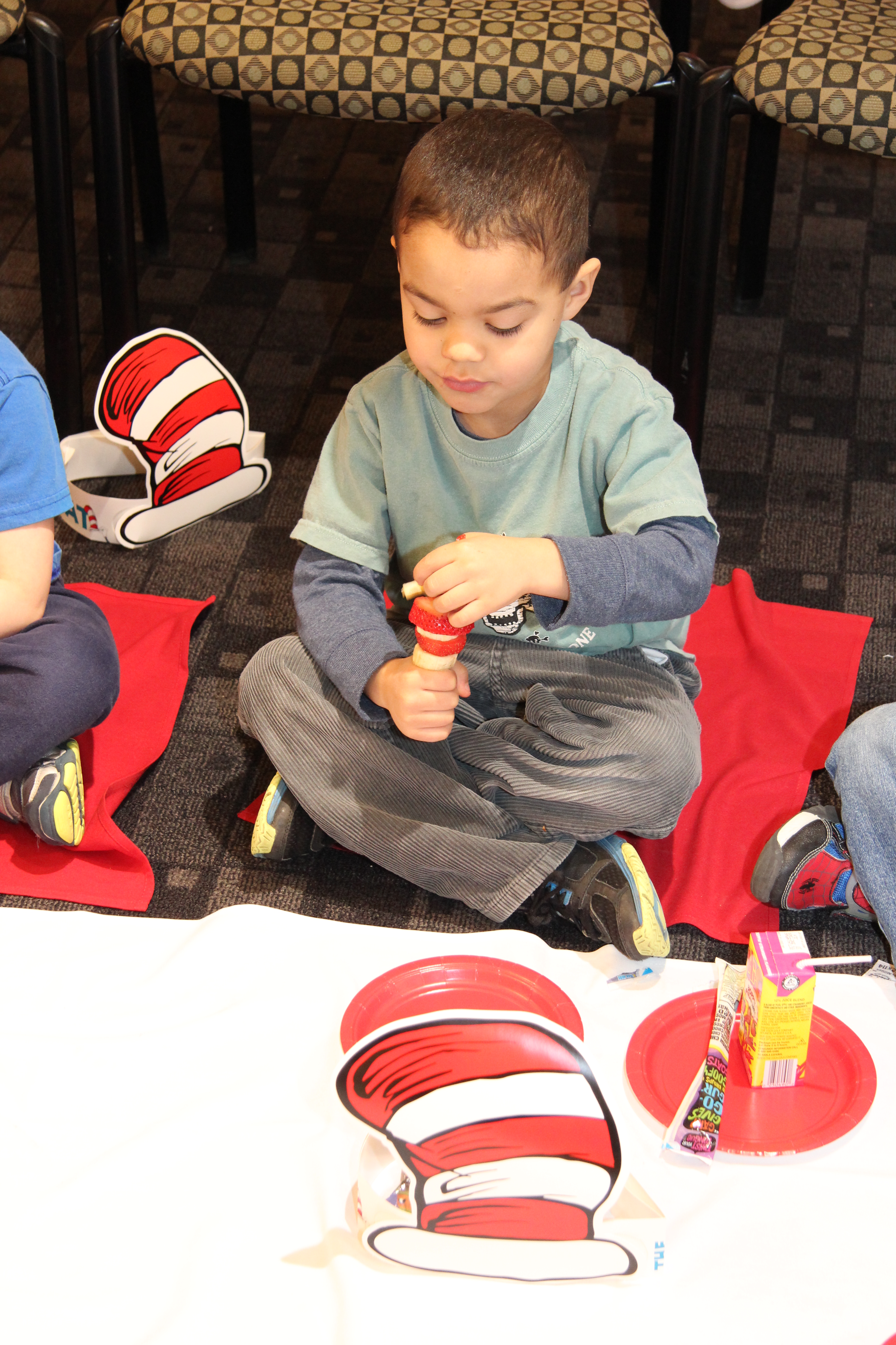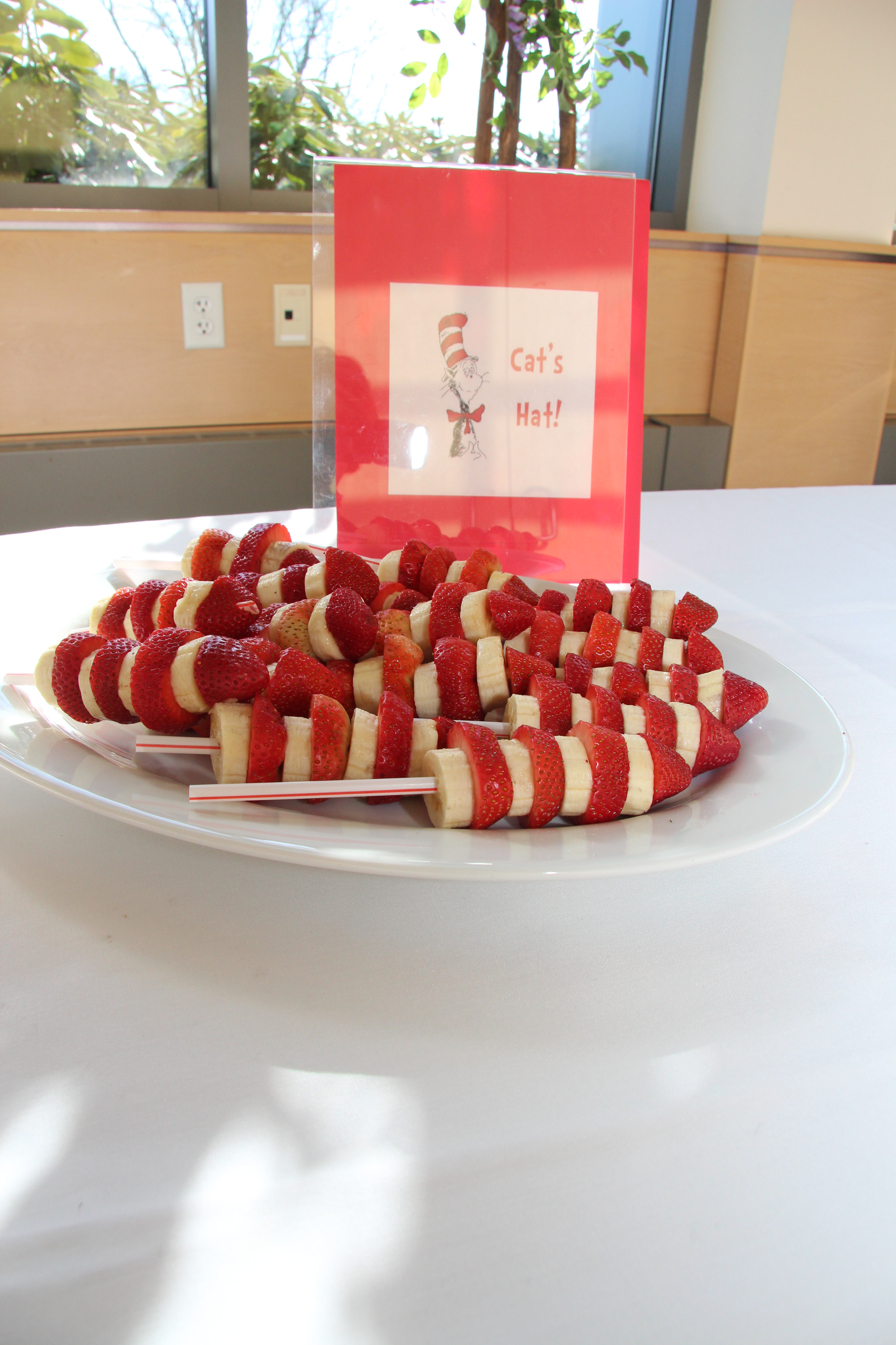 Wearing red and white stripped Dr. Seuss headbands, the children feasted on skewers of strawberries and bananas, yogurt, and juice. The children were given copies of the iconic book as they were leaving the party.