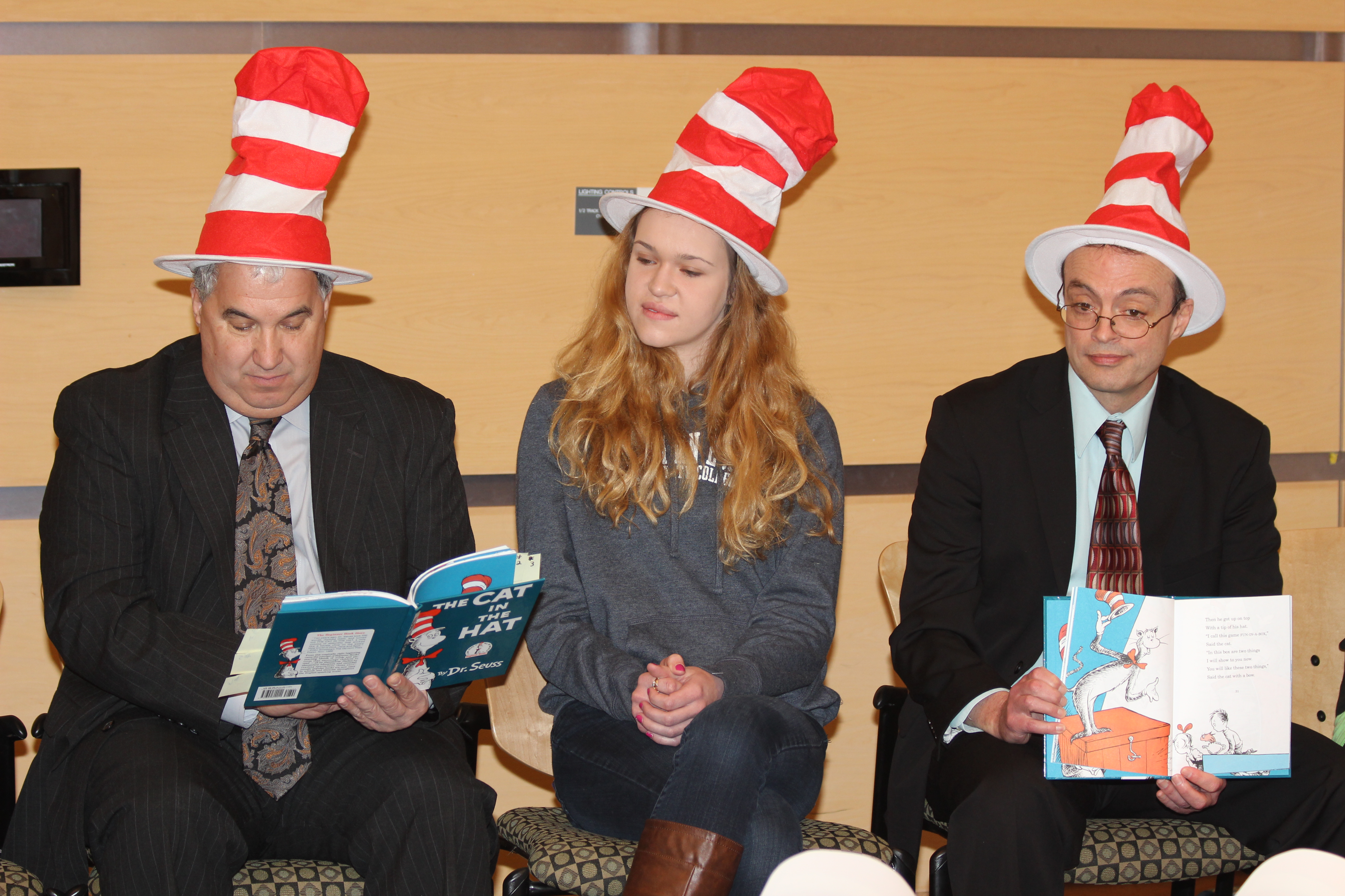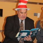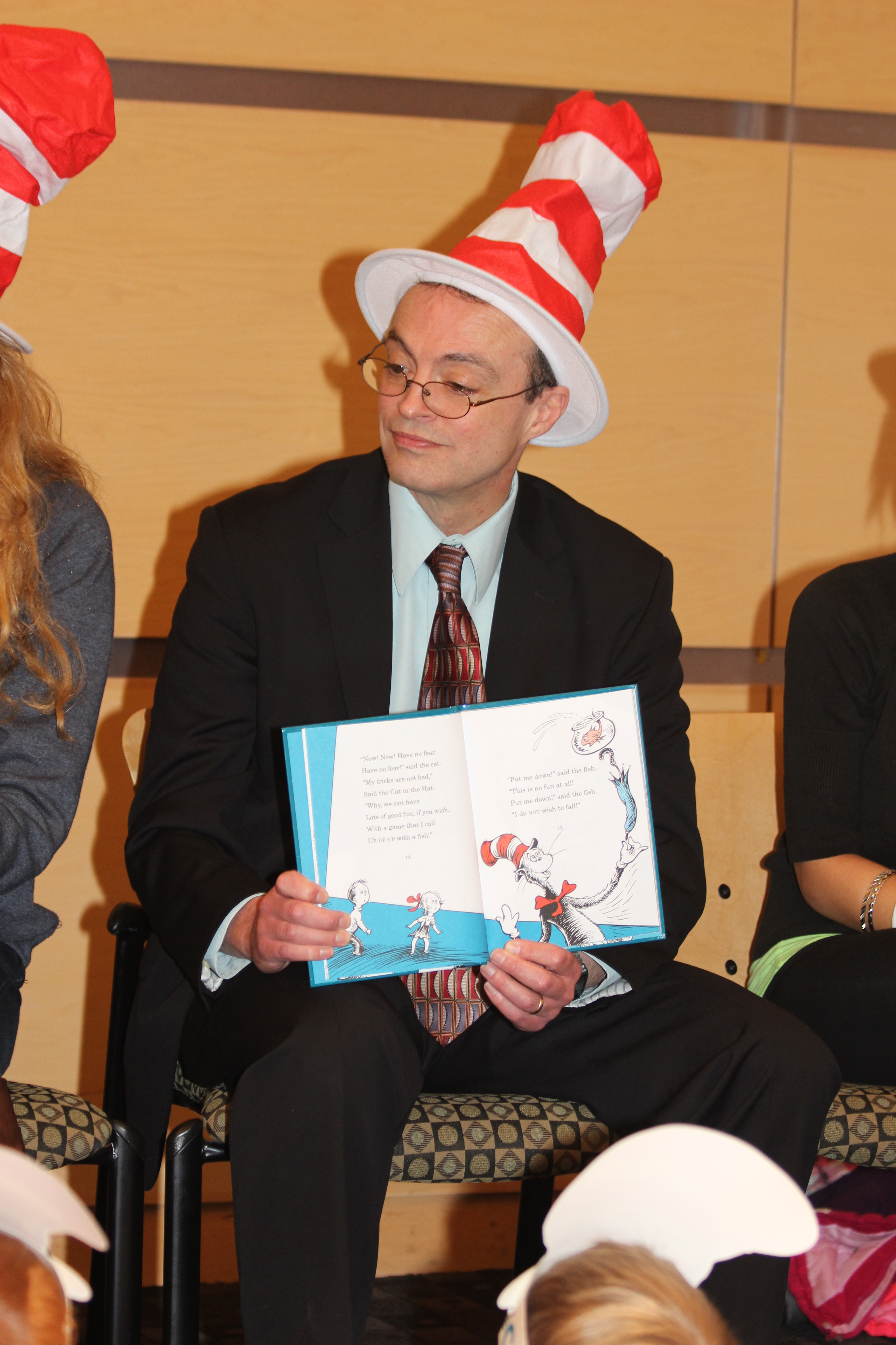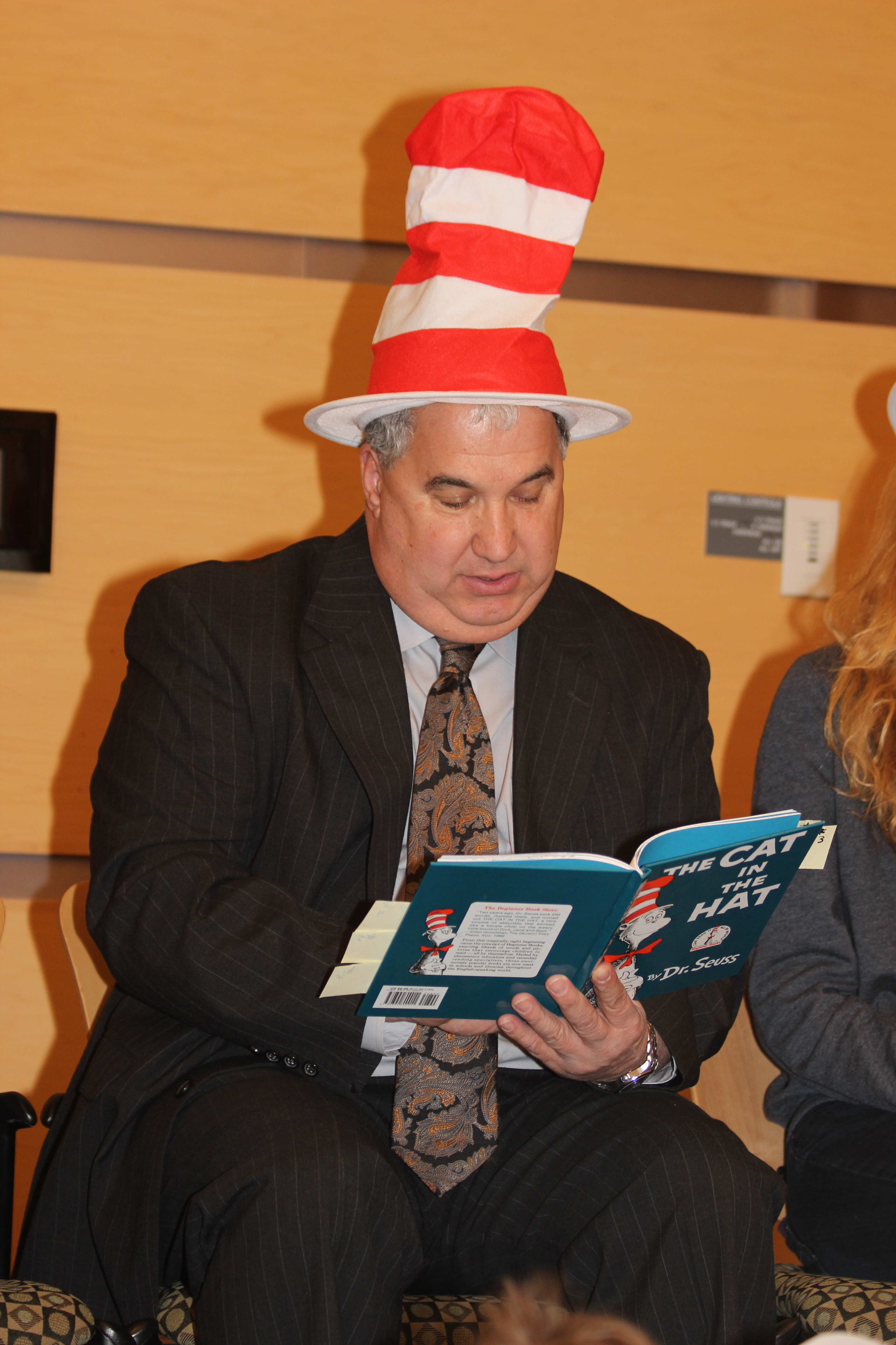 Sponsored by NECC’s office of institutional advancement, three NECC early childhood education students joined NECC’s George Moriarty, executive director of workforce development and corporate relations ; David Gingerella, vice president for administration and finance, and Bill Heineman, vice president of academic affairs, in reading “The Cat in the Hat” to the children.