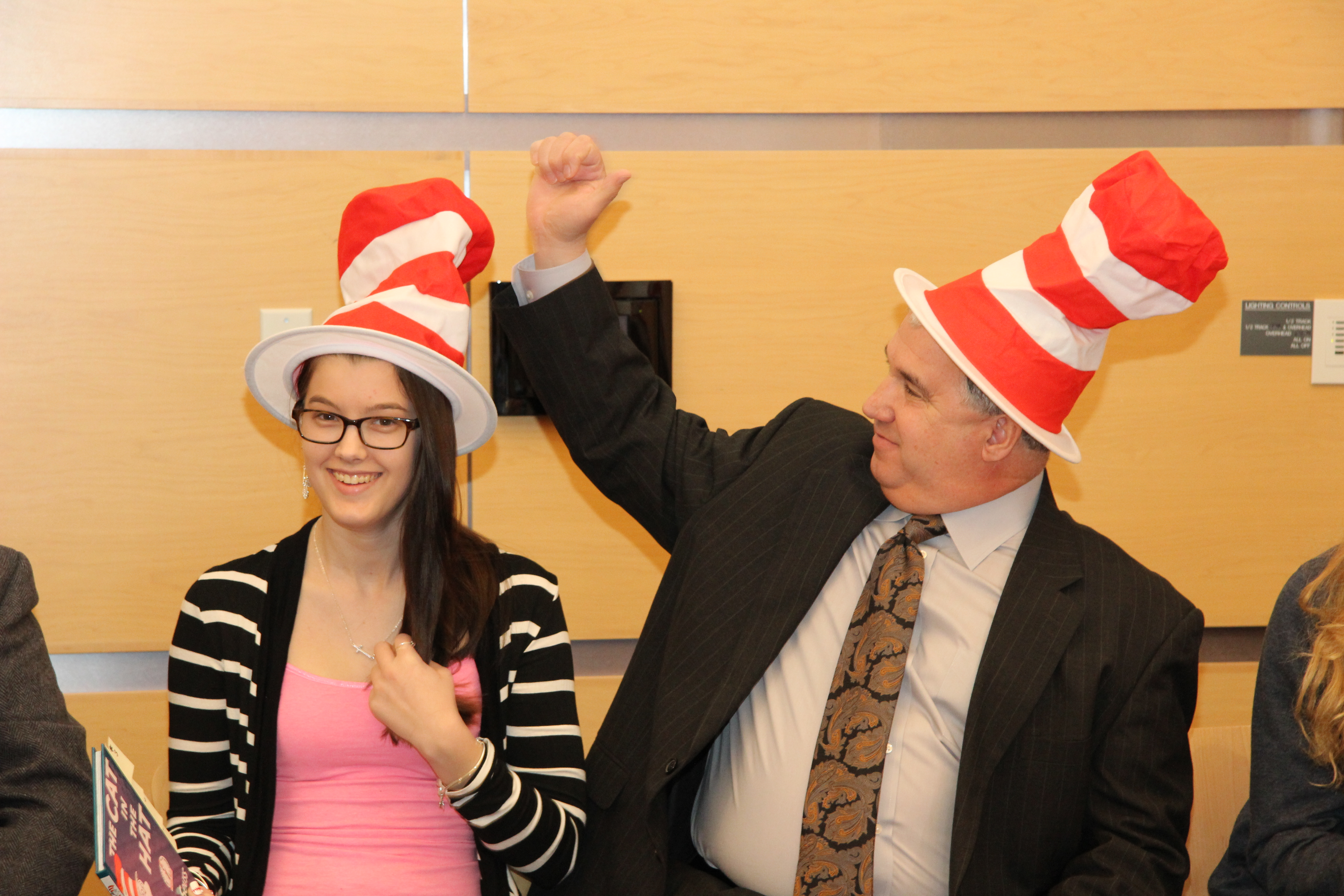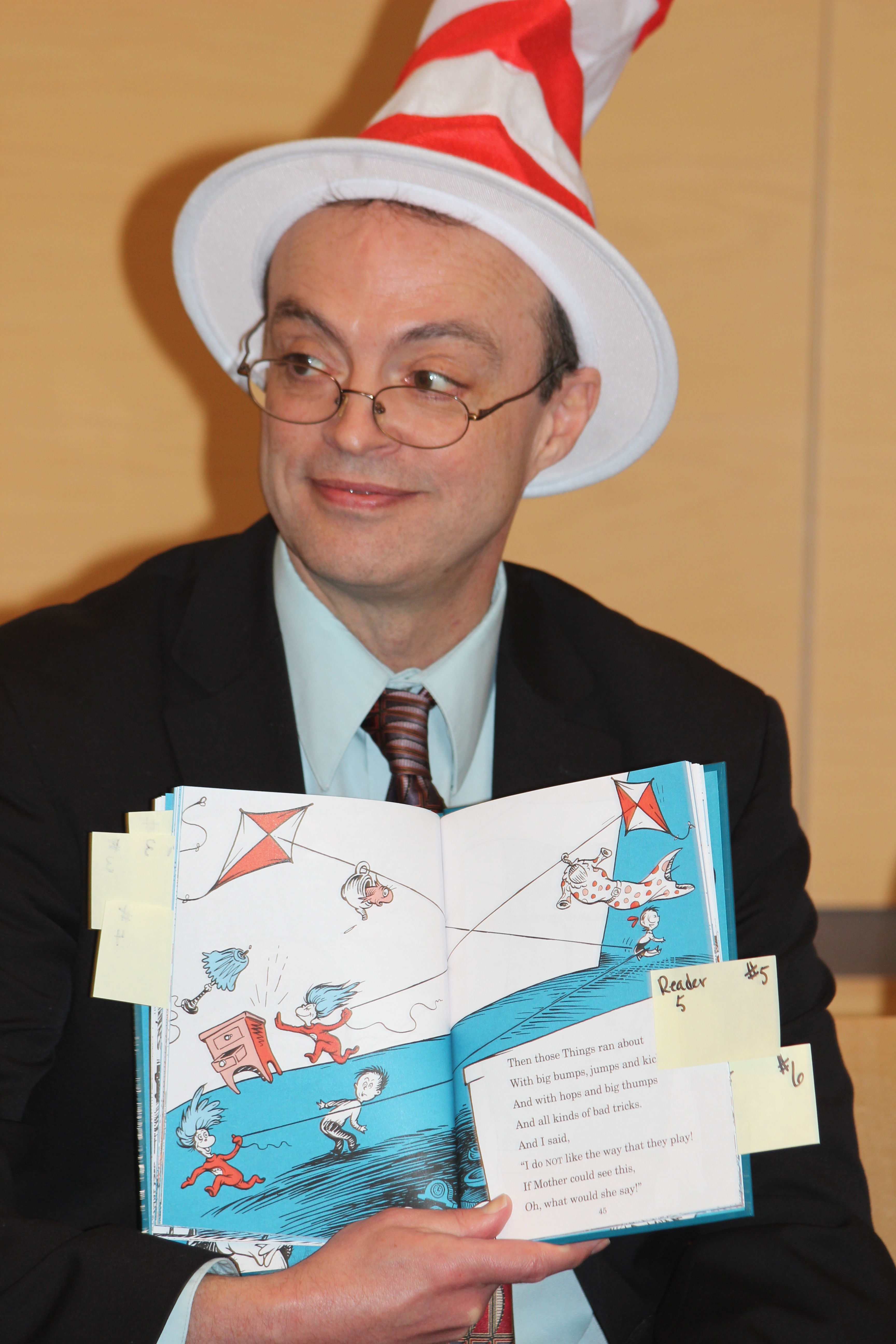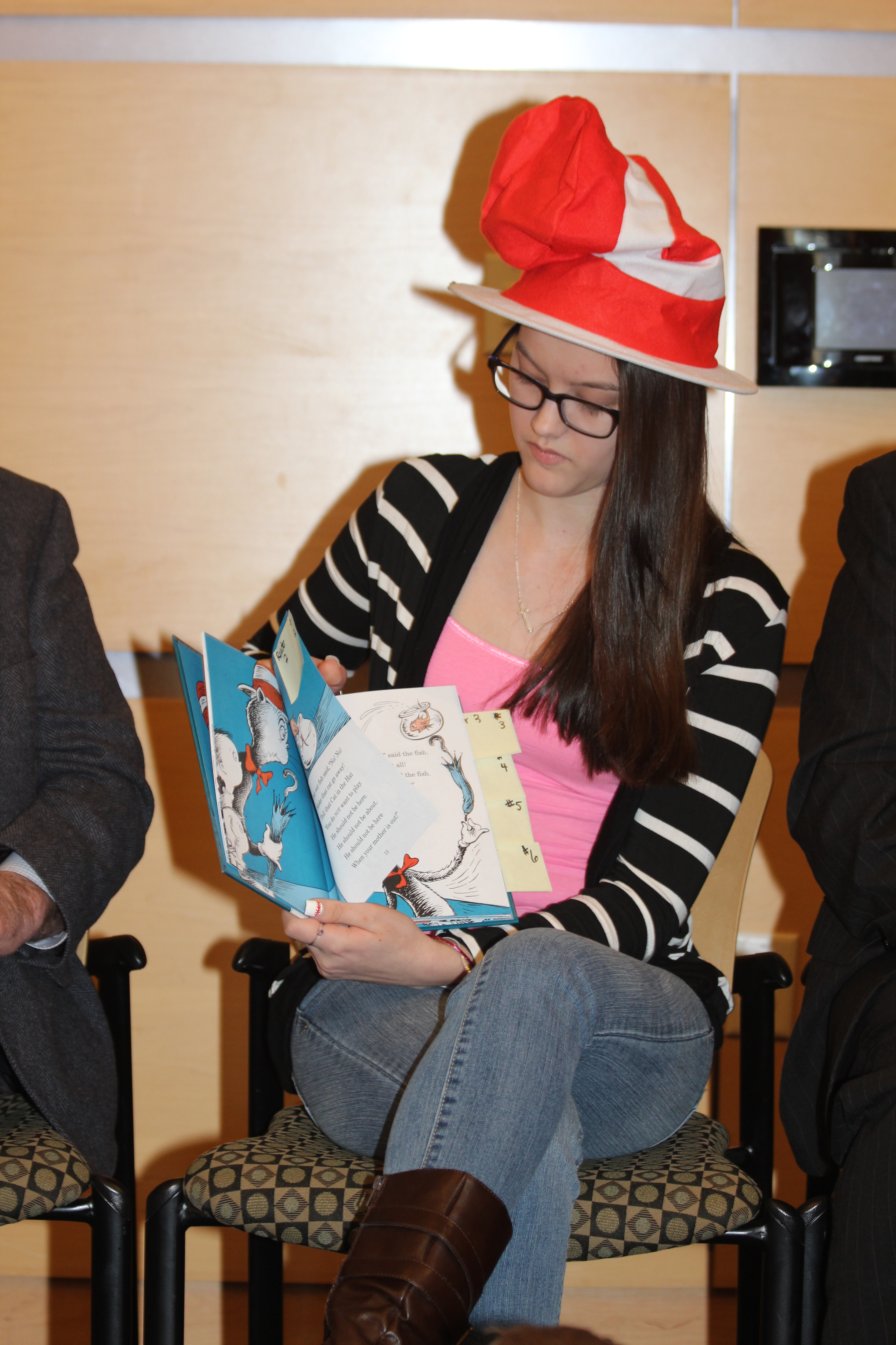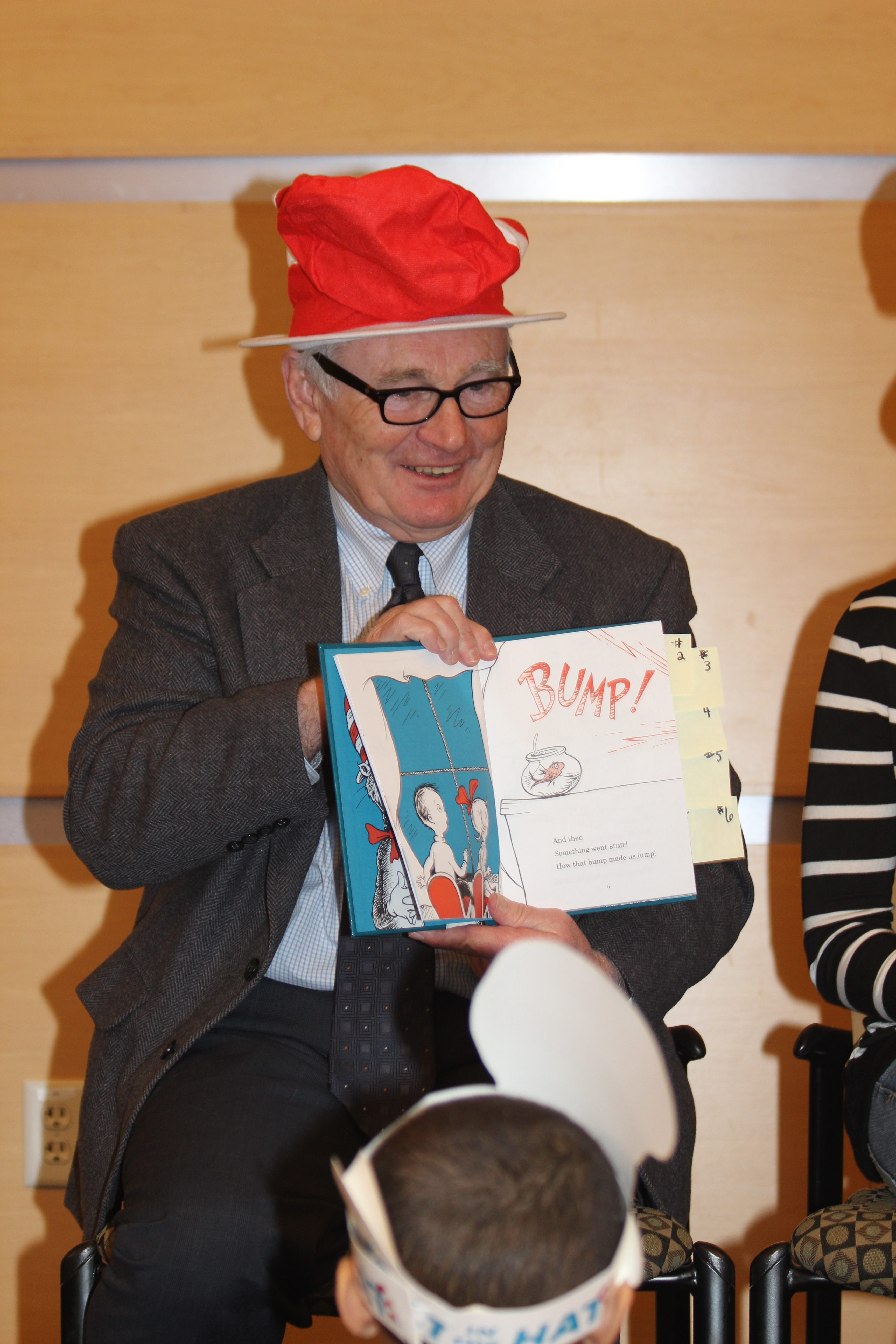 Sponsored by NECC’s office of institutional advancement, three NECC early childhood education students joined NECC’s George Moriarty, executive director of workforce development and corporate relations ; David Gingerella, vice president for administration and finance, and Bill Heineman, vice president of academic affairs, in reading “The Cat in the Hat” to the children.