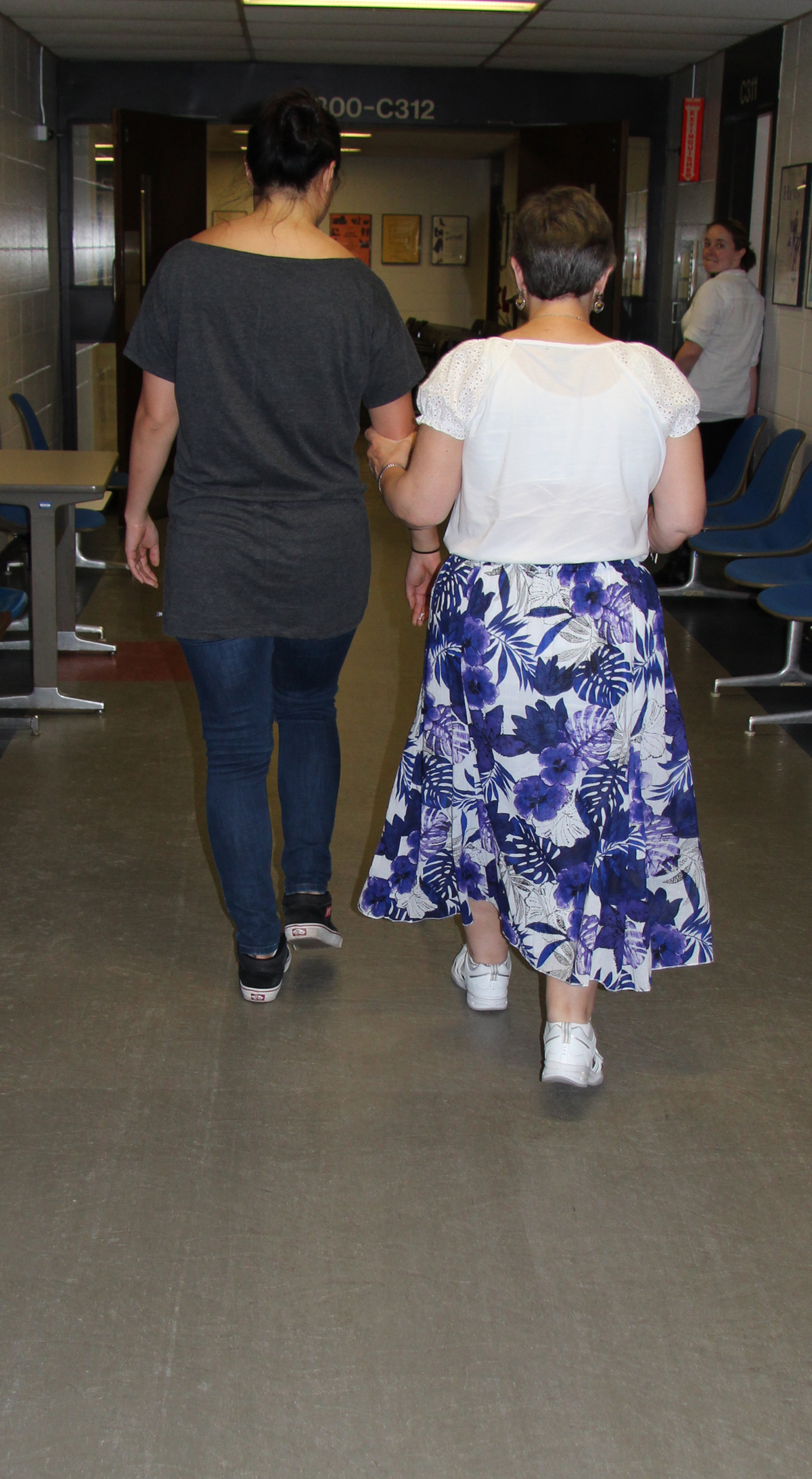 Allison Chang of Brighton practices guiding Stephanie Mcquiggins of Pembroke, who is blind and deaf, through the NECC hallways.