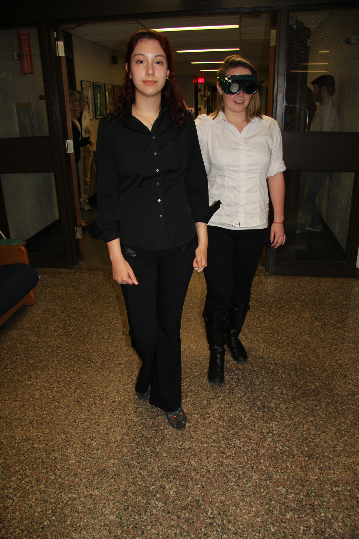 Sighted guides in training – Kaitlynn Leary of Haverhill assists Alex Canning of Salisbury, who is wearing goggles to distort her vision to give her a sense of what it is like to walk with poor or no vision.