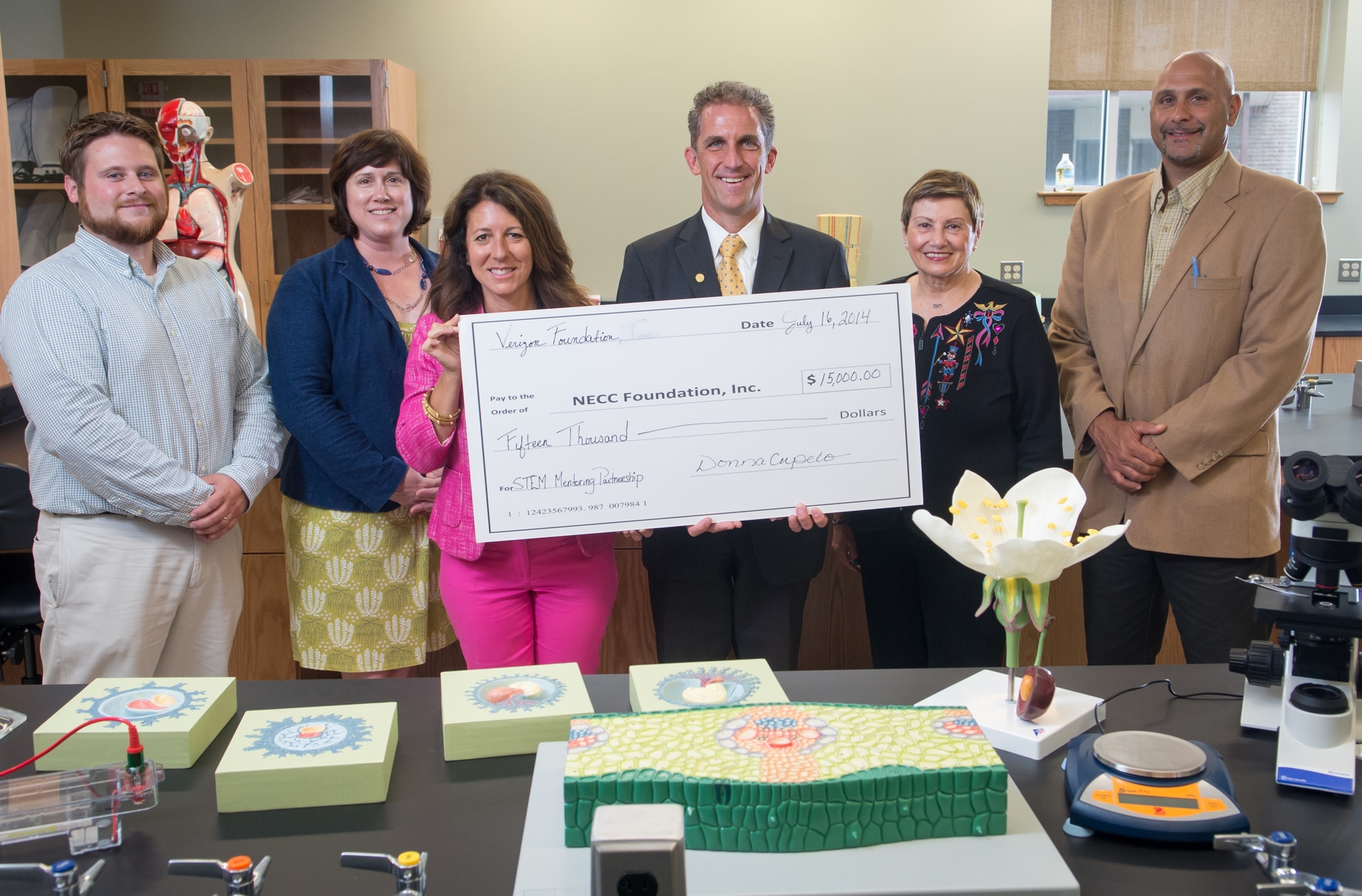 Shown left to right: Bob West, NECC laboratory technician/safety officer; Martha Leavitt, NECC director of campus operations, administration ,and finance; Stephanie Lee, Verizon regional director of government affairs; Lane Glenn, NECC president; Jean Poth, NECC vice president of Institutional Advancement; and Michael Fiato, LHS head master.