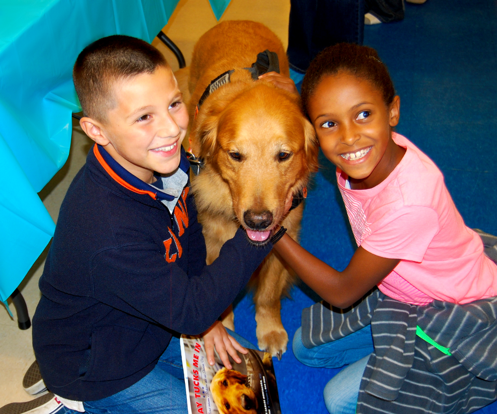 Captain Montalván is a 17 year U.S. Army veteran. He and Tuesday read their new children’s book, “Tuesday Tucks Me In” to local families and students. Guests were able to witness the loyal bond and love that Luis and Tuesday share. Tuesday enjoyed a mini grooming session by Montalván, complete with his favorite chicken flavored toothpaste. Tuesday then demonstrated his retrieval skills by helping Montalván with his cane and various other items.