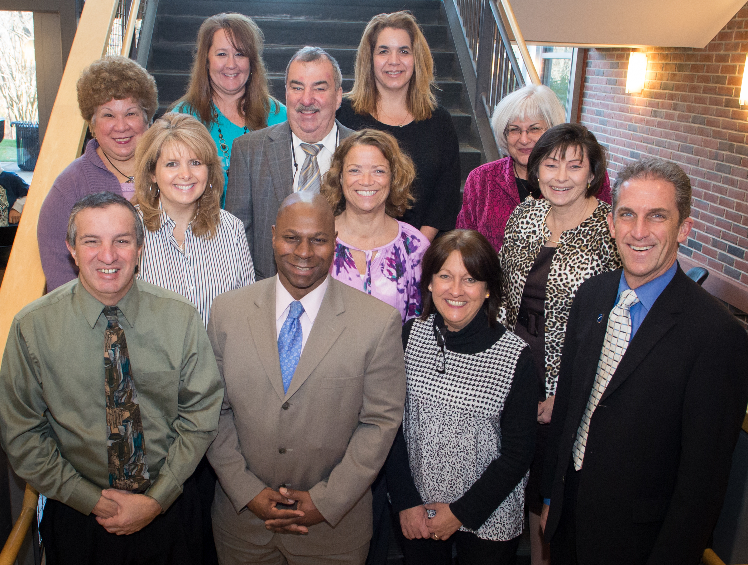 NECC President Lane Glenn poses with staff from the ValleyWorks Career Center which is now located on NECC’s Haverhill Campus.