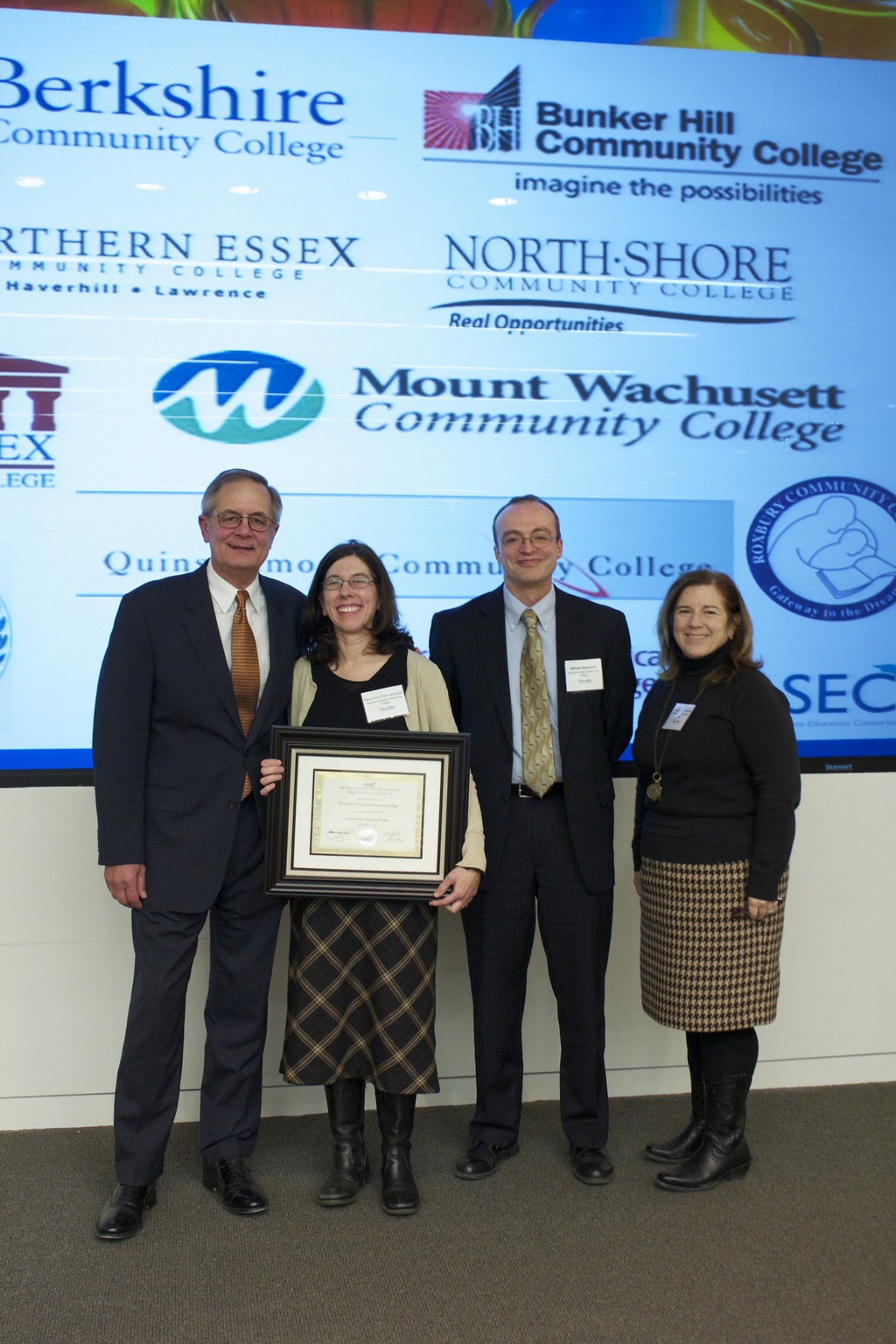 Lance Hartford, executive director of MassBioEd Foundation; Marguerite White-Jeanneau, professor of natural sciences; Bill Heineman, vice president of academic and student affairs; and Carolyn Cohen-Knoepfler,PhD, Acting Assistant Dean of Math and Science.