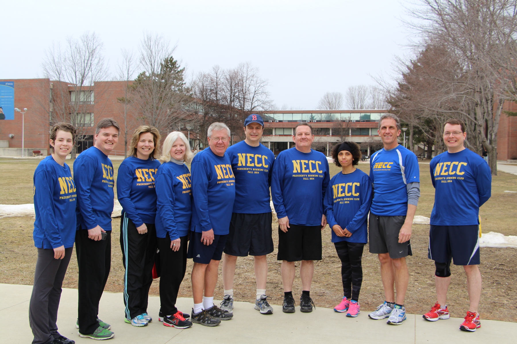 The NECC President’s Running Club has been training all winter for the 2nd annual NECC Campus Classic 5K and Fun Run on May 2. Shown left to right are Sofia German, student; Jeff Bickford, staff; Sharon McDermot, staff; Pam Donahue, faculty; Al Hitchcock, staff; Jim Cahaly, faculty; Ken Thomas, faculty; Sagraria Cosme, student; Lane Glenn, president; and Nate Gilbert, staff.