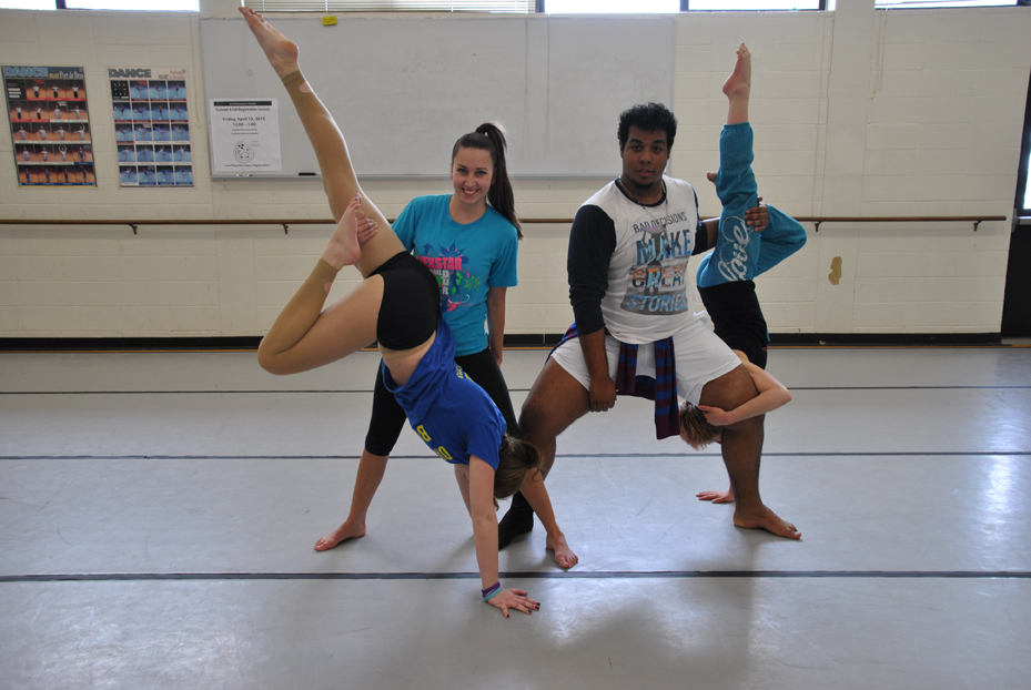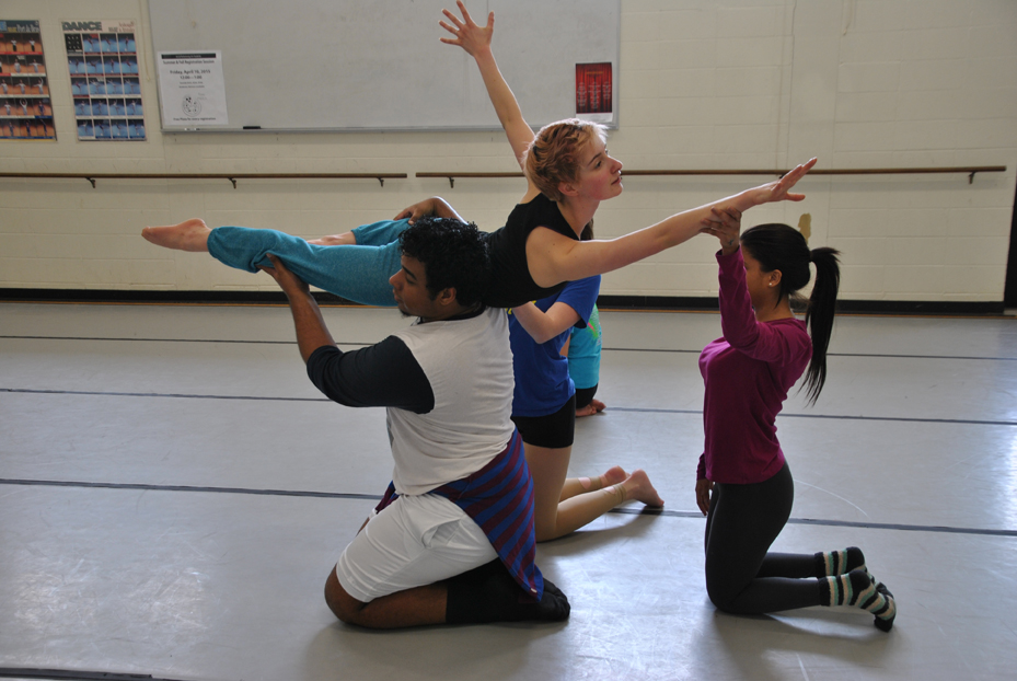 NECC dance student Nina Cabral of Pelham, NH, is held by fellow dancers during a modern dance that will be performed during the Stillpoint Dancers’ spring performance at Lawrence High School.