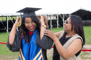 NECC graduate Jessica Castillo of Lawrence gets help with her graduation cap from her mother Ascension Vasquez of Lawrence.