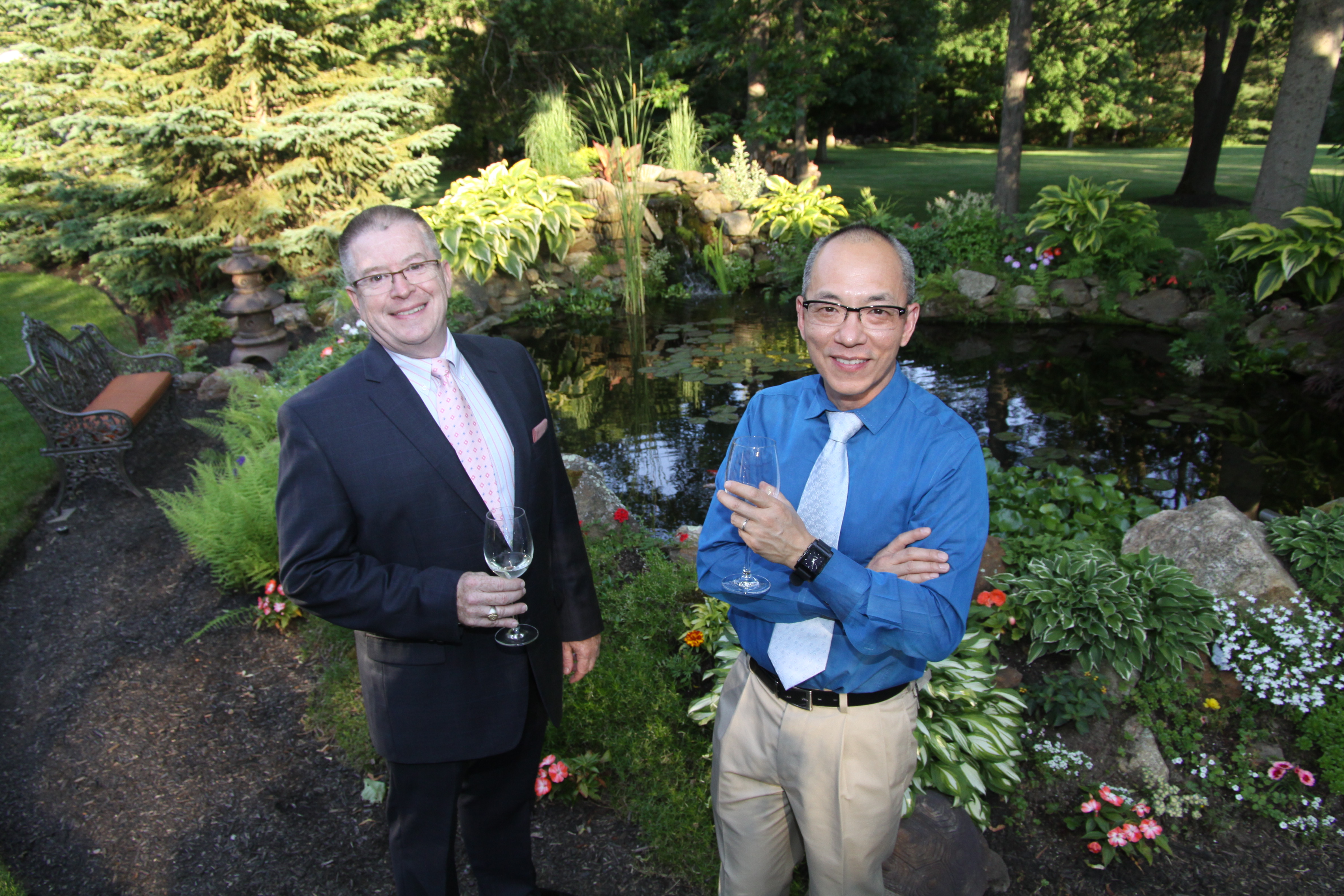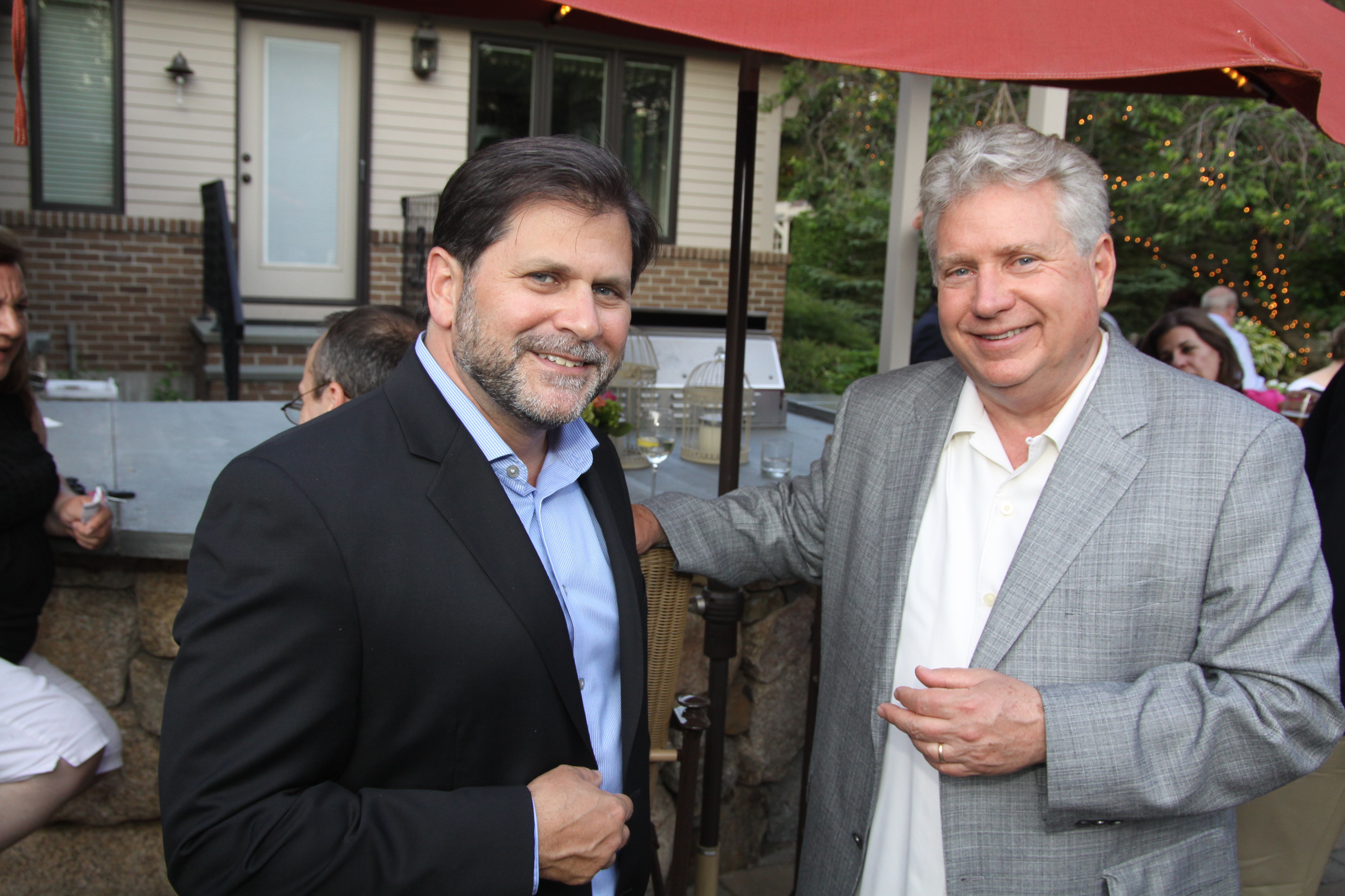 Glenn Prezzano, editor and publisher of Merrimack Valley Magazine, (L) and Larry McHugh, who hosted the Women of NECC June event along with his wife Linda, chat during the event.