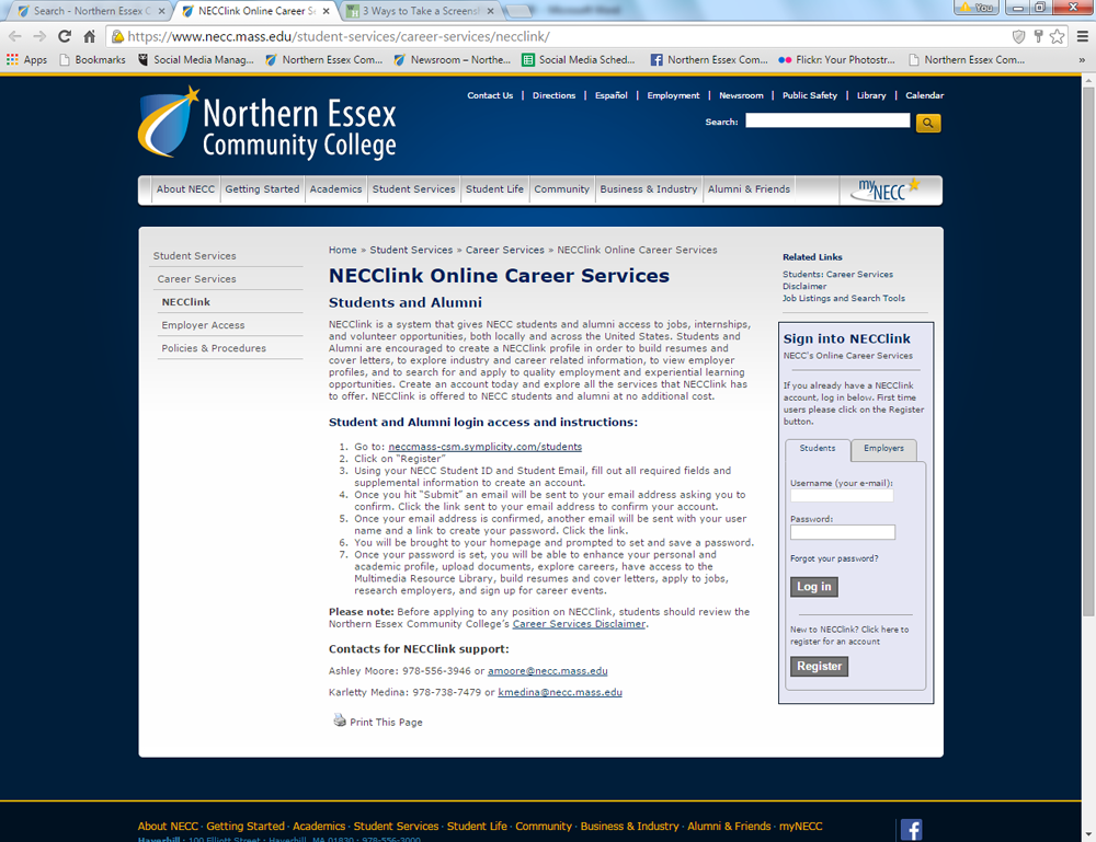Now all students enrolled at Northern Essex are automatically registered in the NECClink database, which is an online career services system that gives NECC students and alumni access to jobs, internships, and volunteer opportunities, both locally and across the United States. Potential employers looking to hire NECC students can register and post job opportunities.