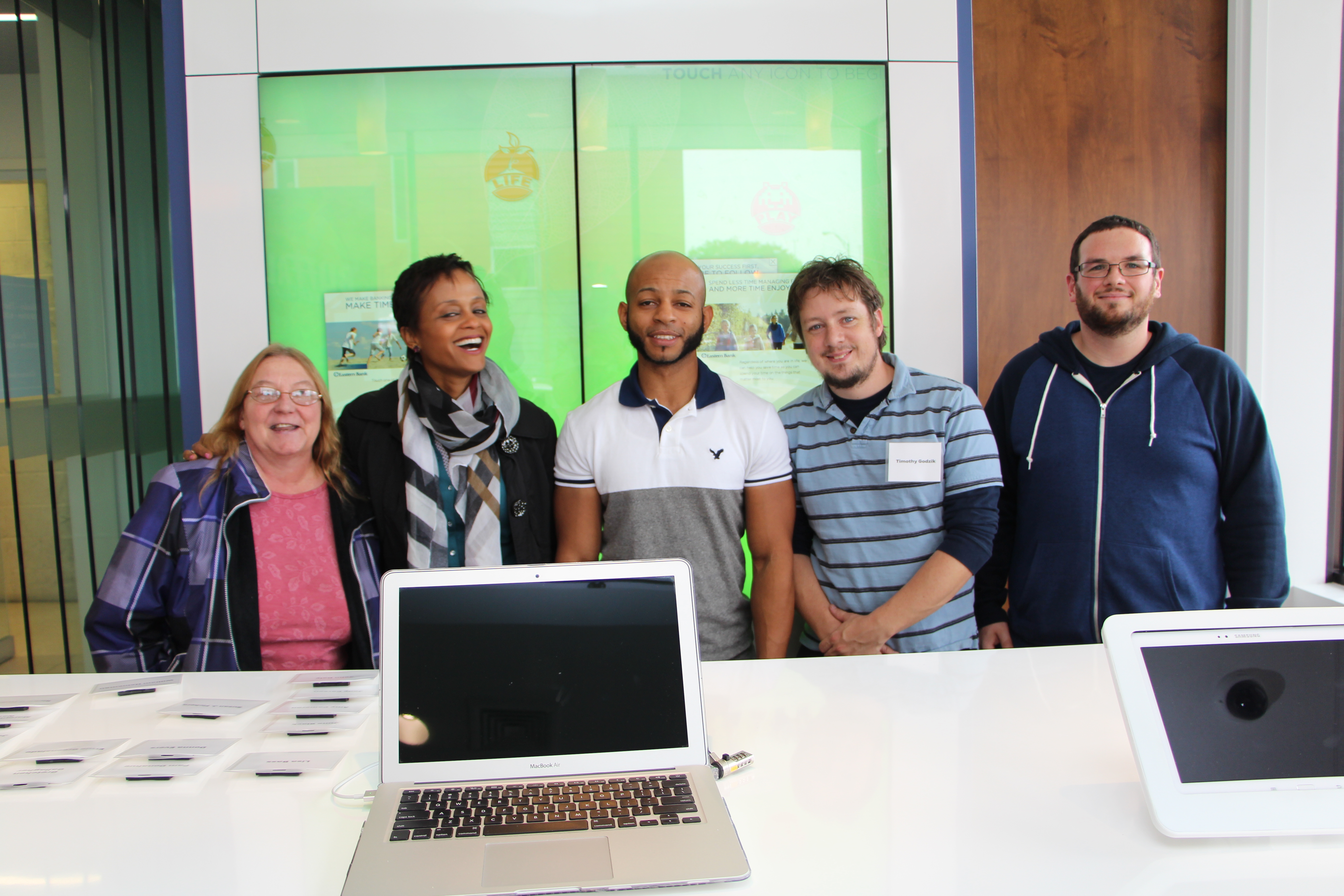 When the bank opened last year, it was called “the branch of the future.”  The space is small—just 350 square feet—but it is packed with amenities including a contemporary lounge area with comfortable couches and high top tables, laptops and tablets for use for free, free Wi-Fi, and a tech bar where visitors can charge their electronic devices, also for free.  Another highlight of the branch is an oversized touch screen which displays tips for financial literacy, covering topics such as buying a house or car, student loans, and how to build your credit score.