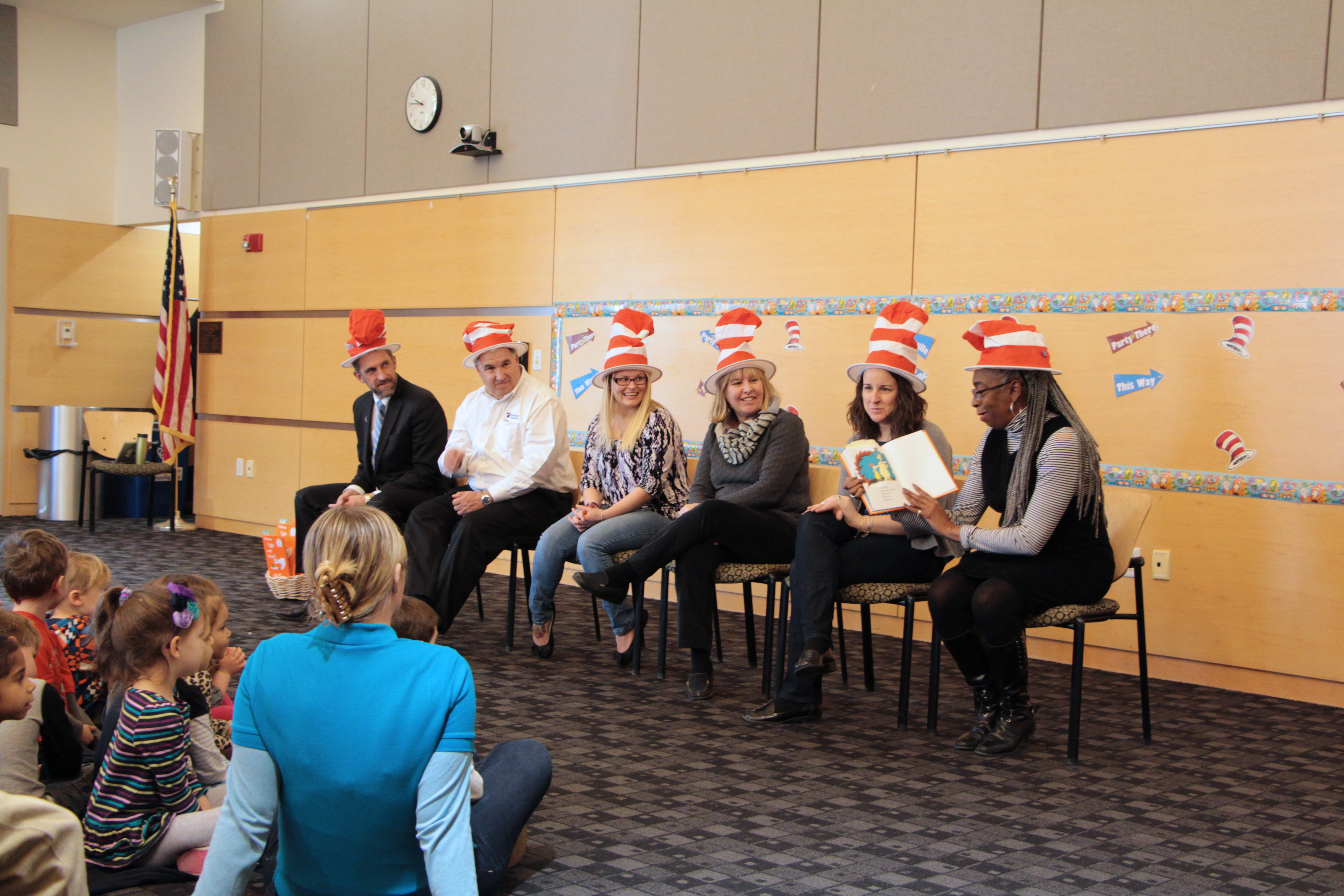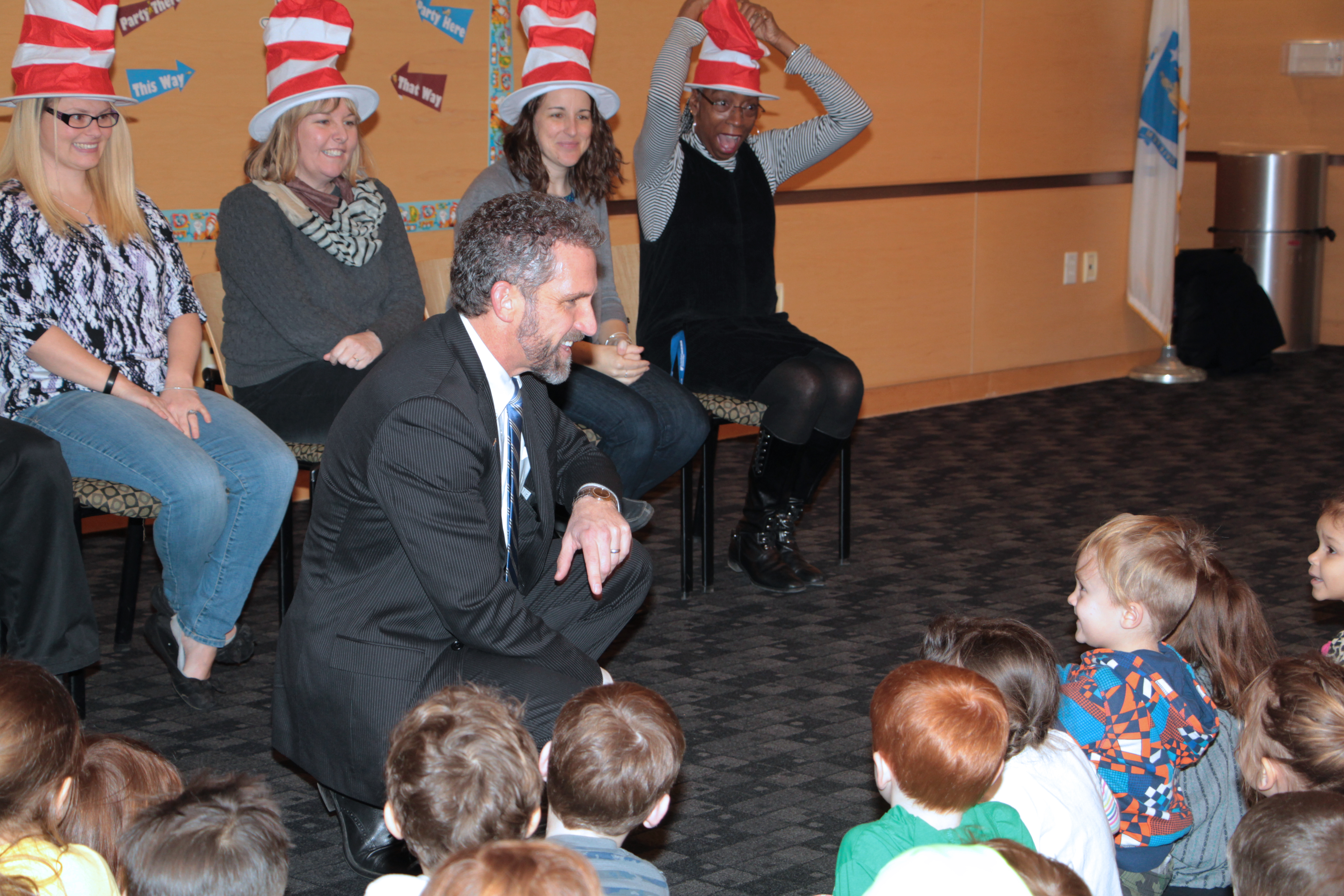 NECC President Lane Glenn reads Dr. Seuss to children from Little Sprouts, which is located on the college’s Haverhill Campus.