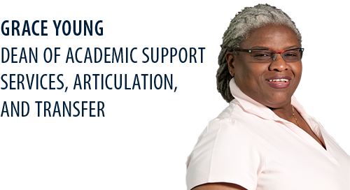 As dean of academic support services, articulation, and transfer, Young is tasked with helping you plan your future. She sees to it that potential and current students continue to uncover the very best version of themselves through higher education.
