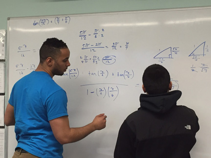 Methuen resident and NECC student Carlos Rivera, who is a student assistant in the Student Success Center, reviews a math problem with a student.
