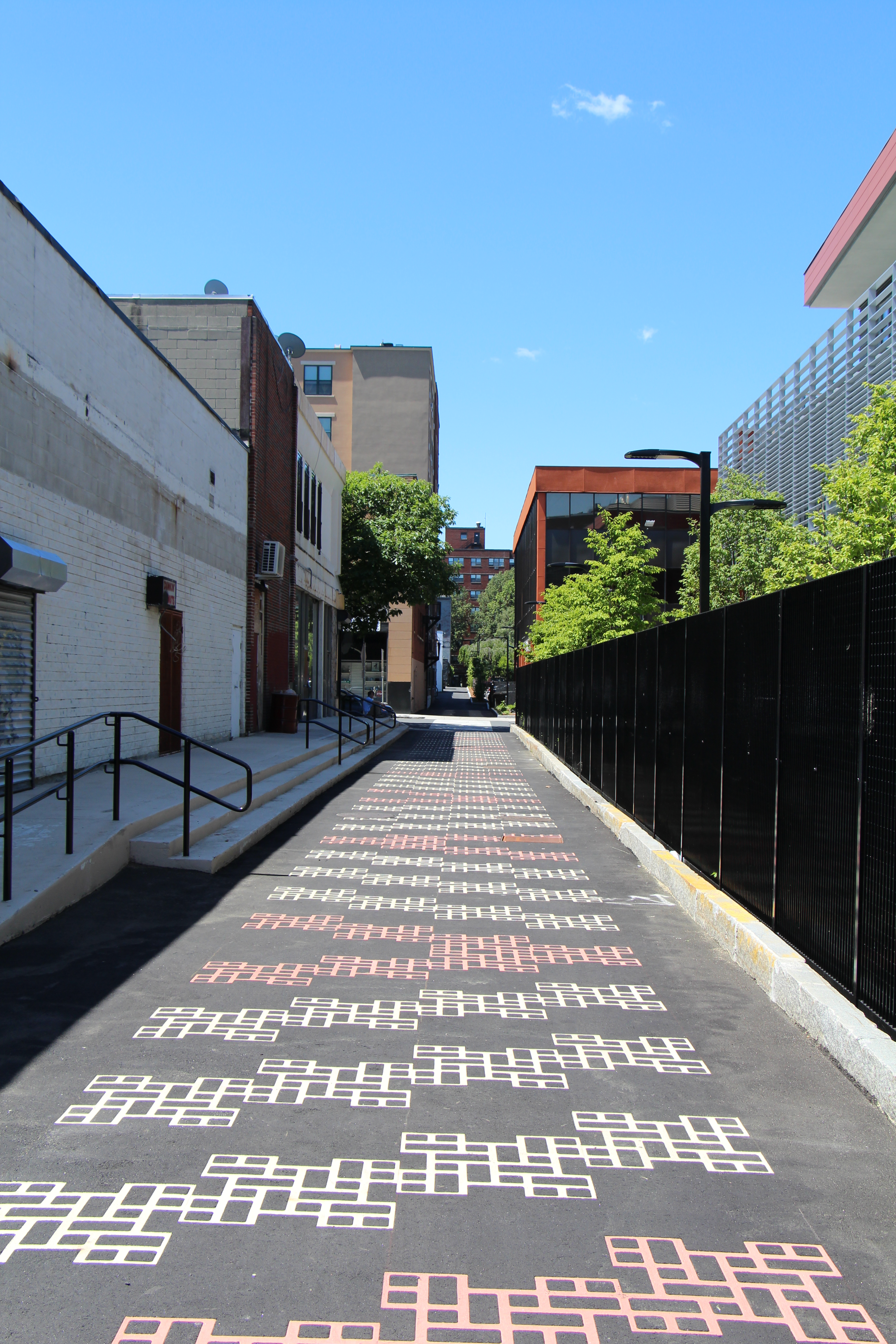 Made possible thanks to a $900,000 Mass Works grant that was announced at the end of 2013, the new space features tree-shaded benches, contemporary lighting, colorful graphic wall murals painted on the sides of buildings, and freshly paved alleys designed with a checkered pattern. The project was supported by a $7,000 gift from the Lawrence Partnership, a private/public sector collaboration for the economic development and general improvement of the City of Lawrence that was launched in 2014.