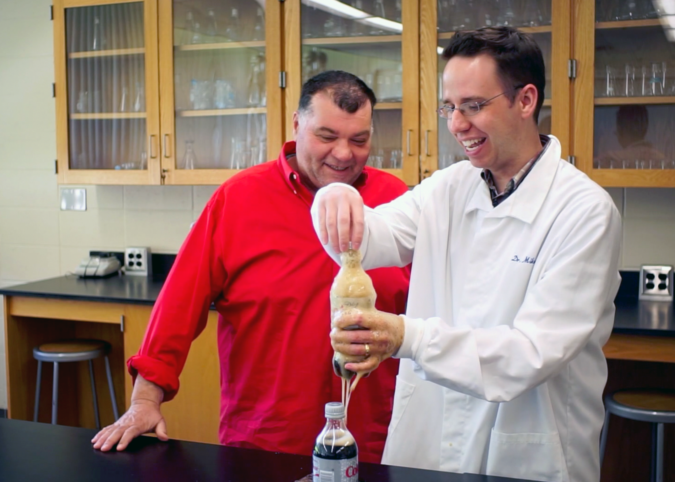 NECC Chemistry Professor Mike Cross demonstrates a prank using chemical concepts to comedian Tony V.