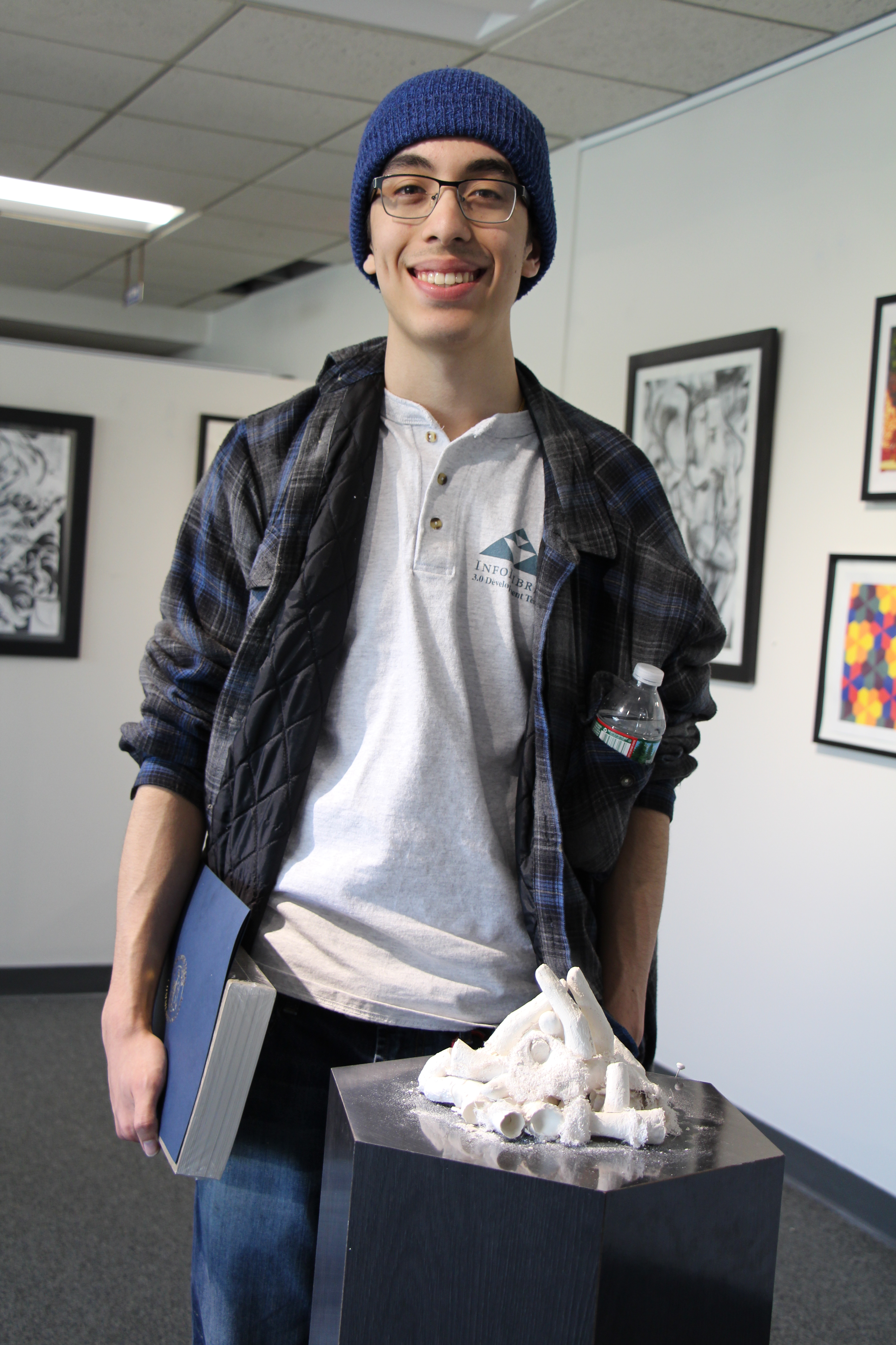 Receiving honorable mention were Glenn Chickering of Salisbury, MA, for his charcoal/gesso drawing titled “Winged Man”; Donald Guidoboni of Andover for his plaster sculpture titled “Forming Figures for Fire”; and Reniery Santiago of Haverhill for her photograph titled “Baby Blue”.