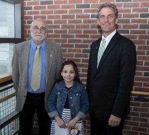 NECC Professor Paul Saint-Amand and President Lane Glenn stand with Peace Poetry winner Malika Meskine, Grade 2.