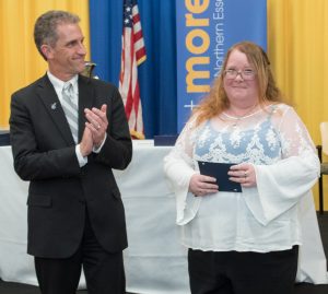 NECC President Lane Glenn applauds Margaret Kostiew, who received the college’s Outstanding Student Award.