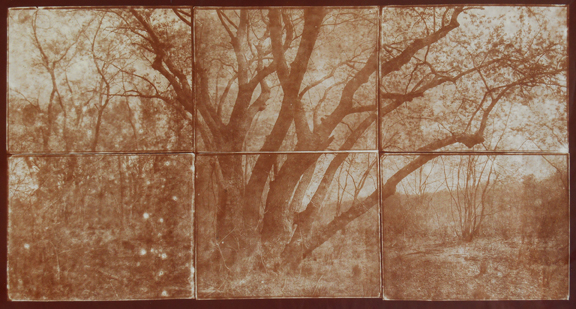 Kurita’s 16×30 “Buds of Spring” Sudbury, MA 2016, is an albumen print created from Talbotype paper negatives. This is an early photographic process that involves using paper coated with silver iodide.  Talbotype is also known as calotype which has Greek origins meaning “beautiful impression”.