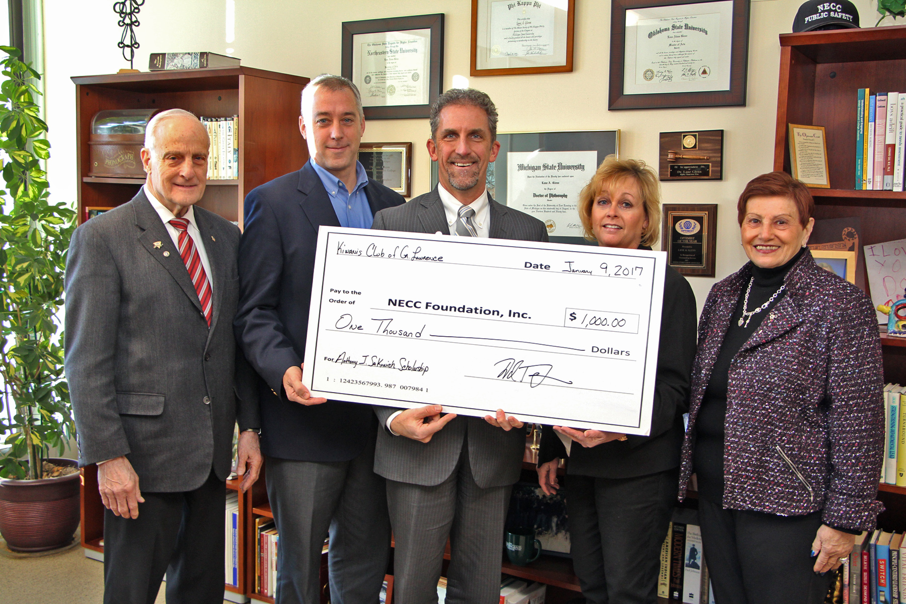 (l to r) Al DeLuca, member of Greater Lawrence Kiwanis Club Foundation Board of Directors; David Louis, Immediate Past President of the Kiwanis; NECC President Lane Glenn; Colleen Coco, President of Kiwanis; and Jean Poth, NECC’s vice president of institutional advancement.