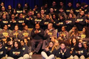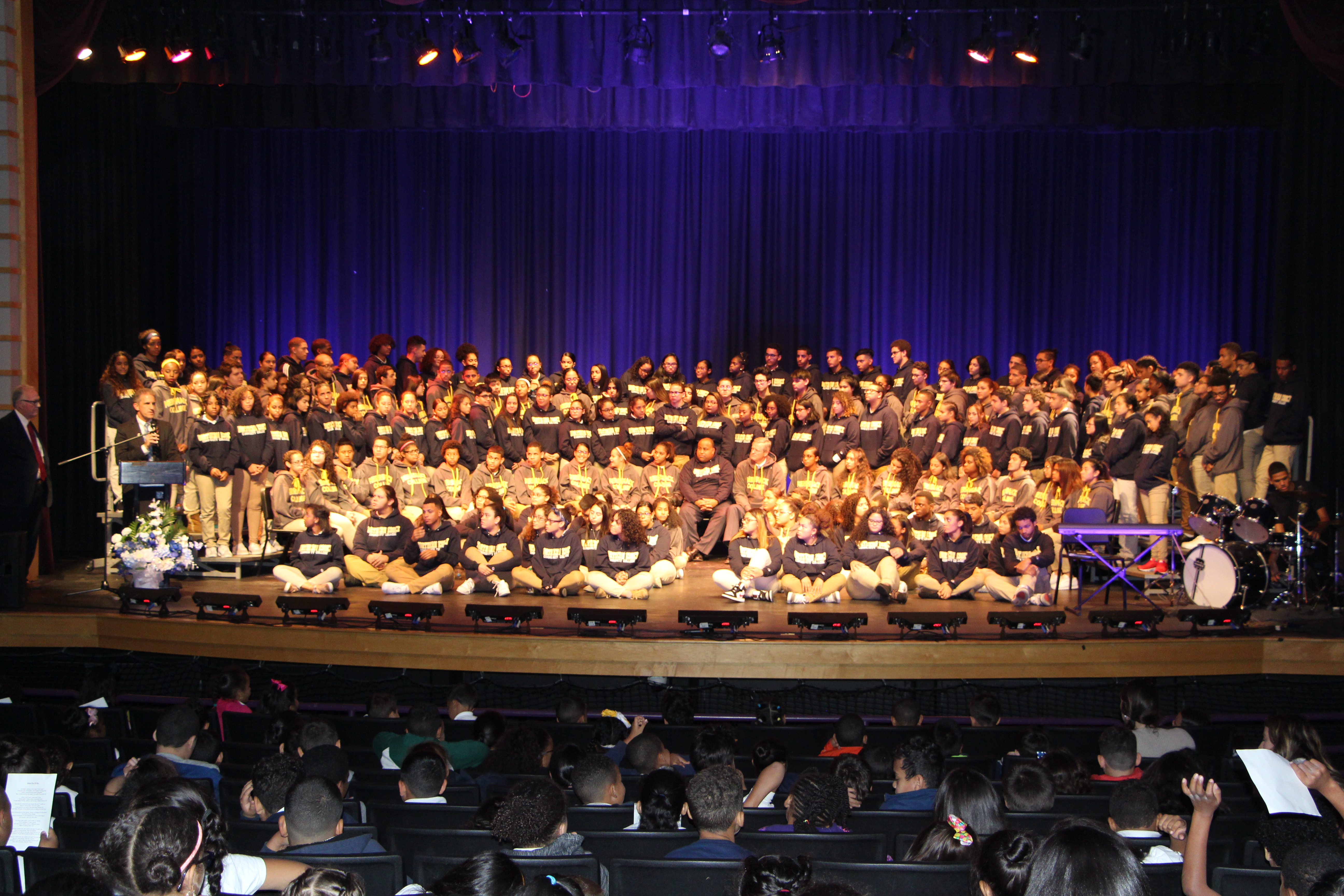 And with that, to thunderous applause, the stage curtains were drawn open to reveal nearly 200 LHS students filling the stage, each wearing the sweatshirt of the college at which they are enrolled.