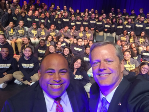 Lawrence Mayor Dan Rivera (left) and Governor Charlie Baker (right) sit in the midst of the nearly 200 Lawrence High School students enrolled in Early College at NECC or Merrimack College.