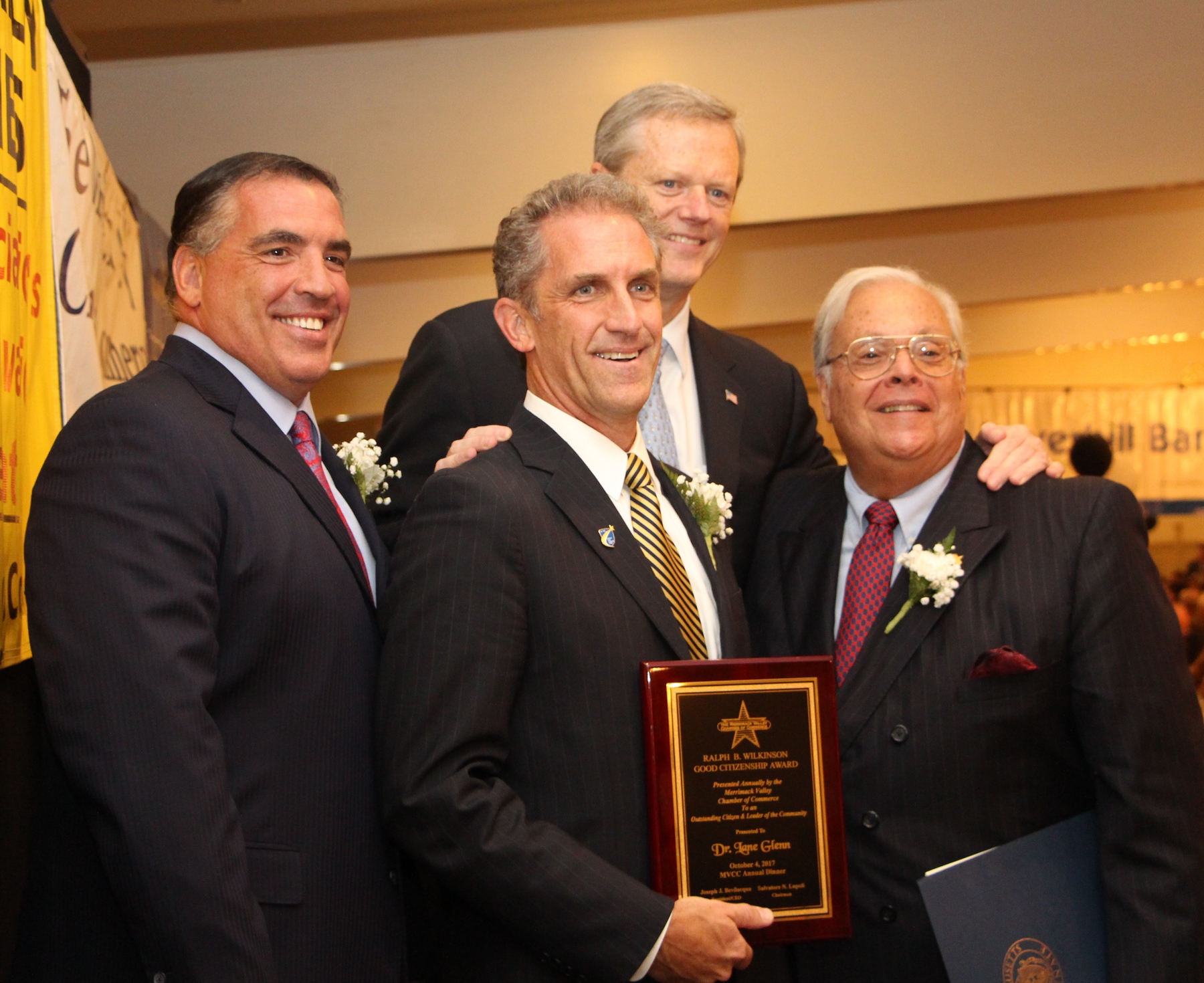 Left to right: Sal Lupoli, chair, MVCC Board; Lane Glenn, recipient of the Wilkinson Award; Governor Charlie Baker; and Joe Bevilacqua, president/CEO, MVCC