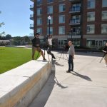 The students in the first group of NECC students to use the new studio were greeted with floor to ceiling windows overlooking a courtyard with a 15-foot water fountain on one side and a bustling Merrimack Street on the other, a rolling news desk, retractable blackout shades, granite floors, cutting edge lighting and equipment, and a control room that operates six cameras.