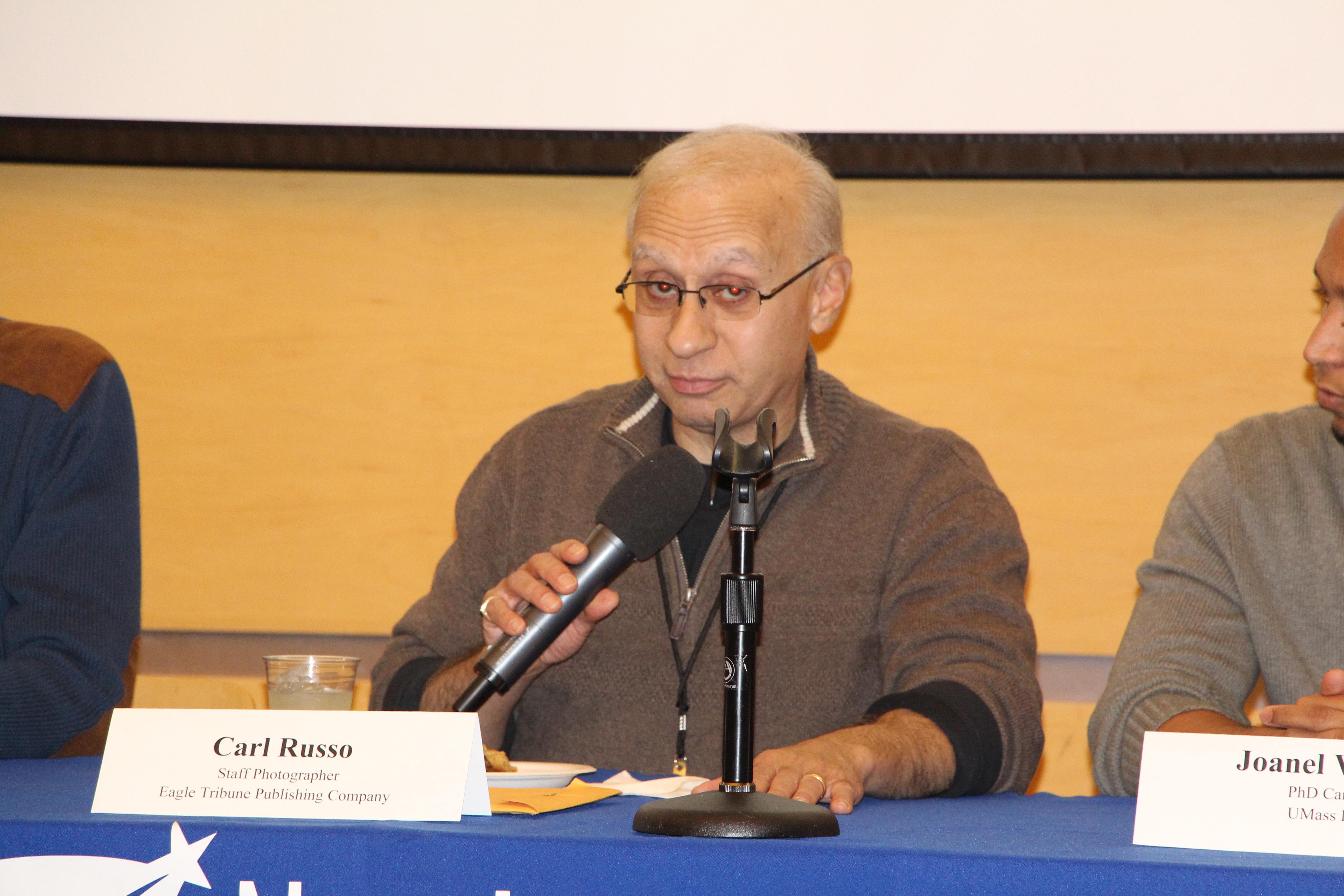 Following the dinner Malik Zorrok, who interned as a sports reporter at the Lowell Sun, presented an overview of the internship. He said his job included writing sports “roundups” and quickly moving on to covering events like half marathons, women’s college basketball, local football and soccer. In addition to punching up his writing skills, he said he had to learn the more subtle act of “reading” his boss and “getting to know” his coworkers.