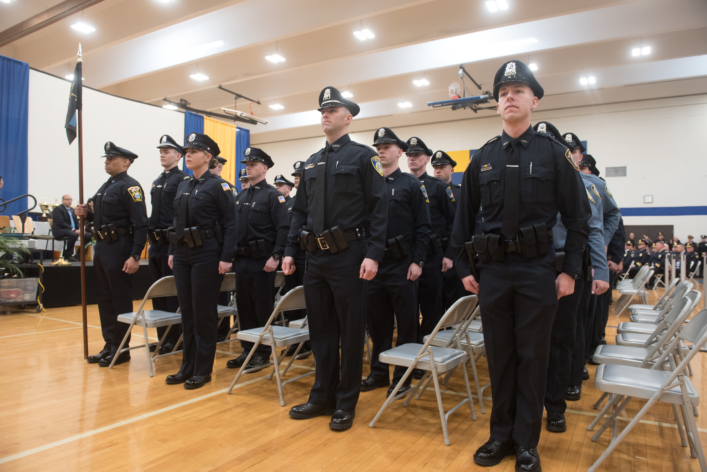 Attending the Northern Essex Community College/Methuen Police Academy is like earning your associate degree, playing a varsity sport, and being in the military all at once, said Thomas Fleming, director of the academy as he addressed the 56 student officers and their families and friends during Friday, February 23, graduation in the NECC Sport & Fitness Center.