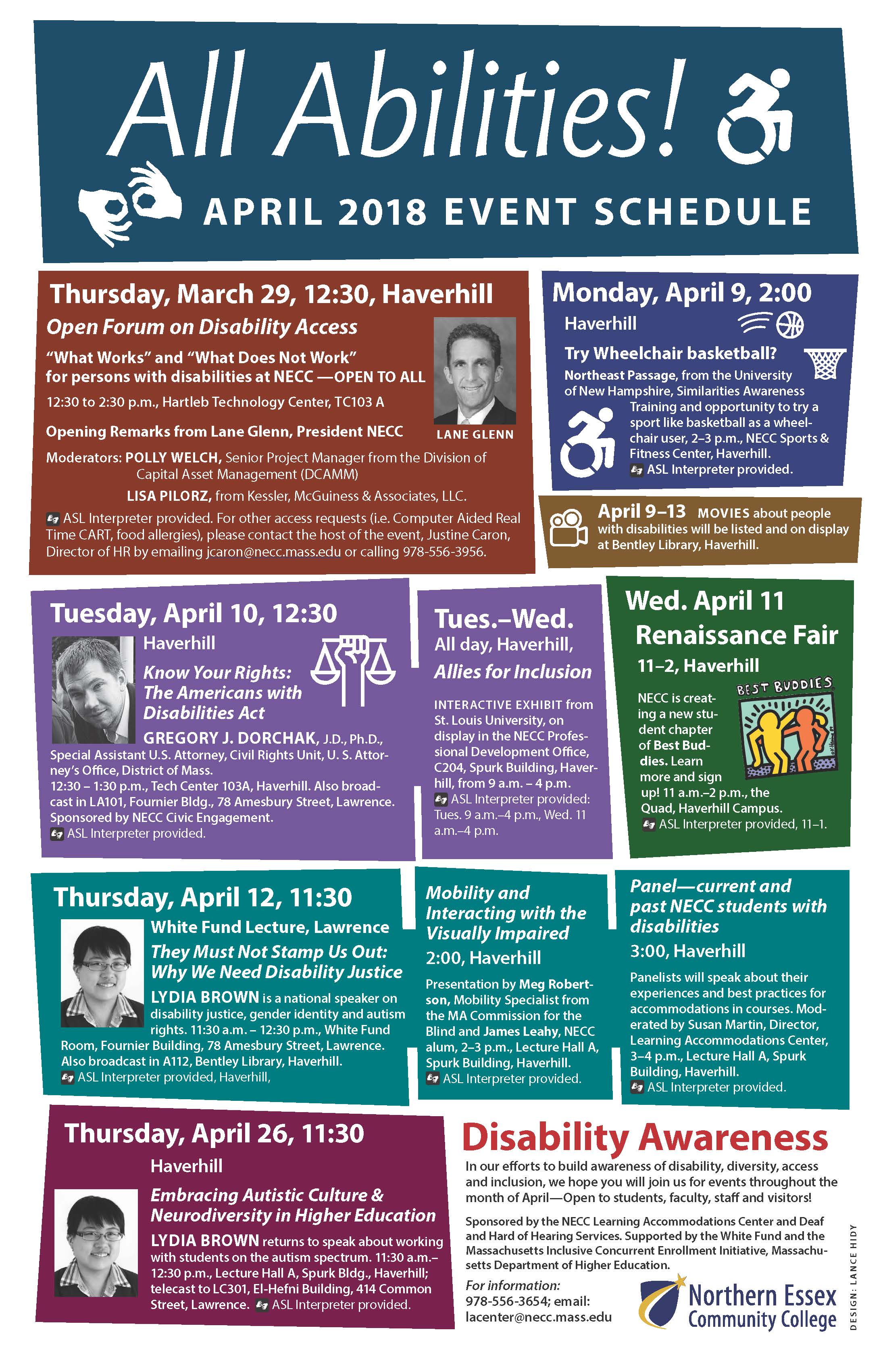For additional information on the “All Abilities” events, contact lacenter@necc.mass.edu or call 978-556-3654.