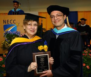 Retired NECC English Professor Terry Cargan accepts her emerita award from Vice President of Academic and Student Affairs Bill Heineman.