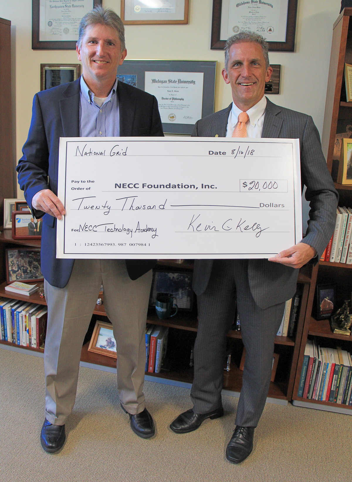 Kevin Kelly of National Grid presents Northern Essex Community College President Lane Glenn with a check for $20,000 to support the NECC summer STEM Academy and College for Kids Program.