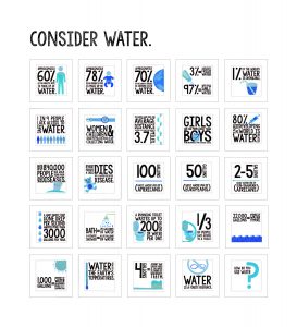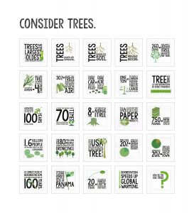 Using hand-drawn lettering mixed with factual data on climate change, Hess has created graphic art that calls attention to water, earth, air, plastic, and trees. Each of these pieces is comprised of 25 framed works while a larger work titled “100 Things” features 100 framed pieces.