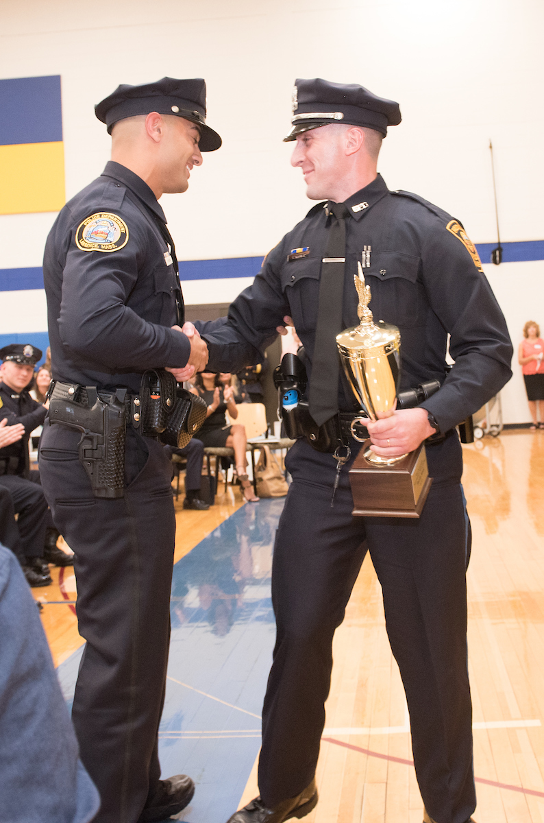 Methuen Sgt. Dan O’Connell, interim NECC/MPD Police Academy director, congratulates a student officer.