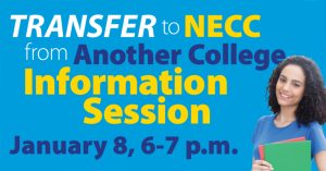 To learn more about transferring in to Northern Essex or the January 8 event, visit the website, or contact admissions, 978 556-3700 or admissions@necc.mass.edu.