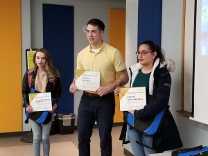 Three NECC Students receive the Knights of the STEM Table Award (L to R) Anglea Reppucci-Mathieu of Methuen, Robert Moeller of Andover, and Aranxa Pena-Mendez of Lawrence.