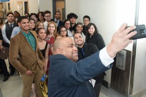 Lawrence Mayor Dan Rivera takes a “selfie” with Lawrence High School seniors in the NECC Early College Program.