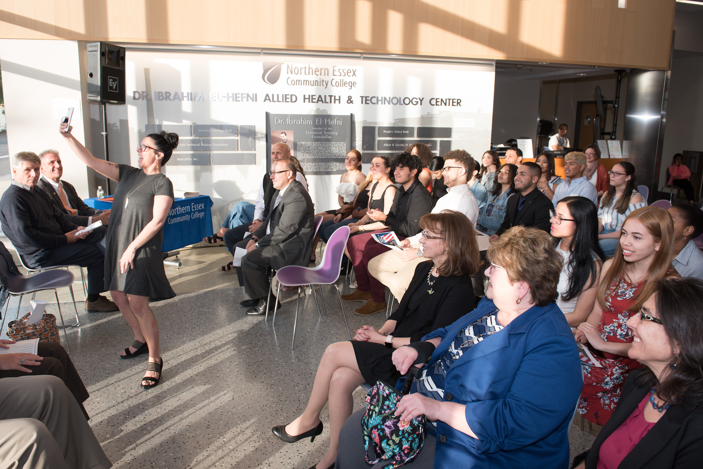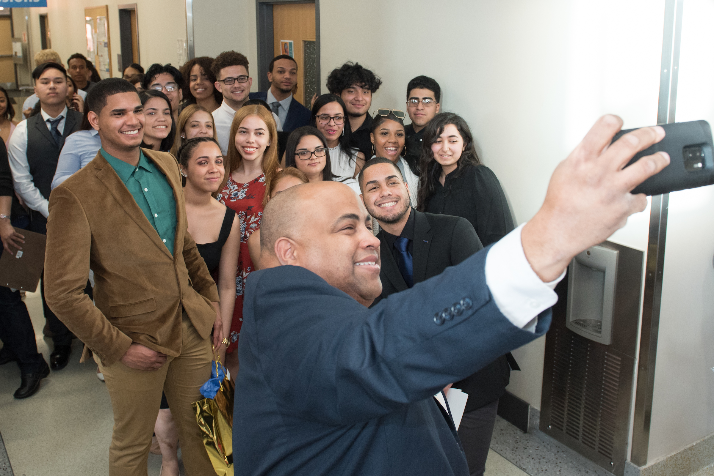 Lawrence Mayor Dan Rivera takes a “selfie” with Lawrence High School seniors in the NECC Early College Program.