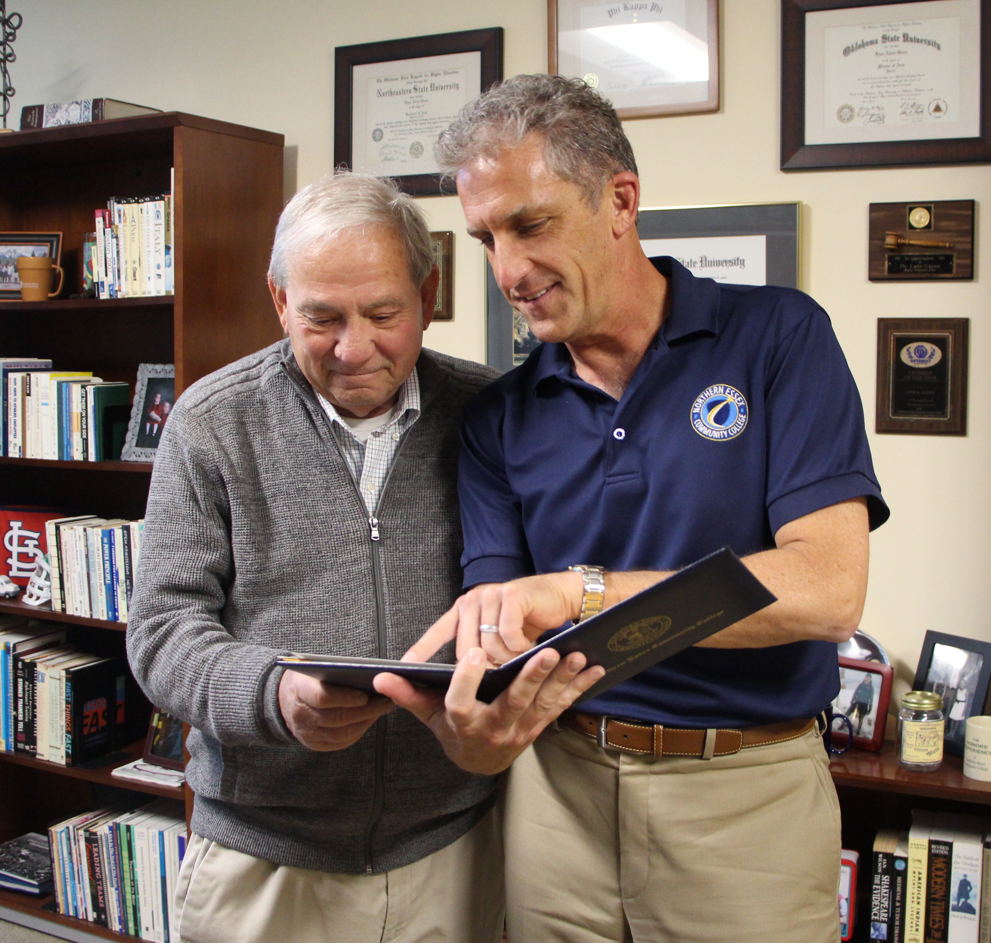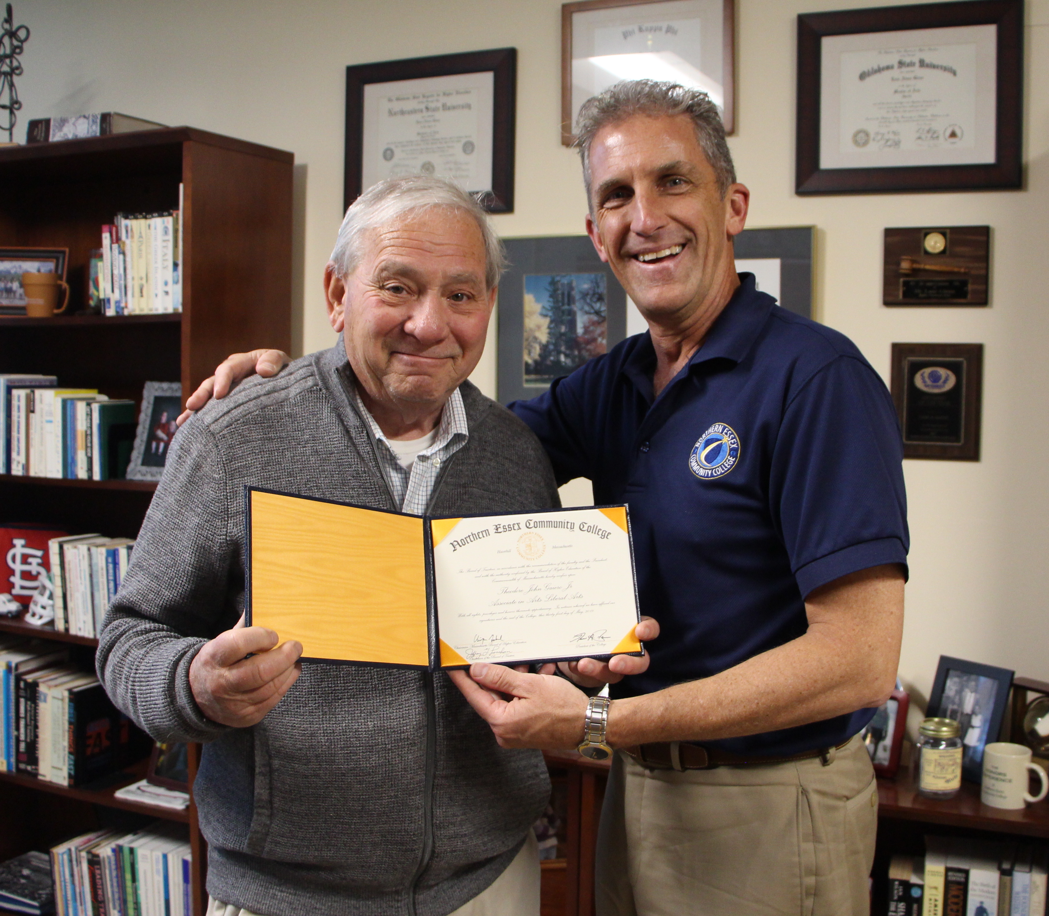 Ted Gaiero of Haverhill receives his associate degree from NECC President Lane Glenn, almost six decades after he started at the college.