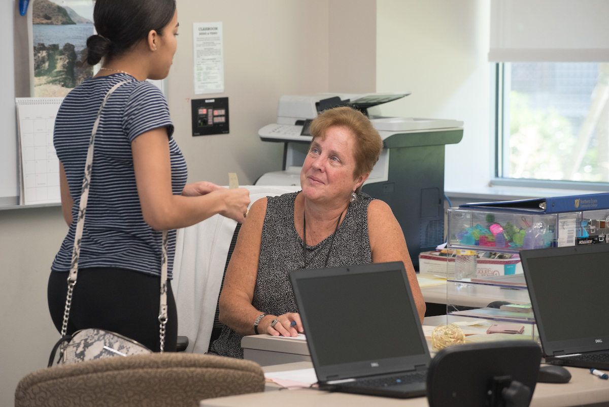 Health professions advisor Linda Comeau speaks with an NECC student in the new Health Professions@NECC Academic Center in the El-Hefni Center on the Lawrence campus.