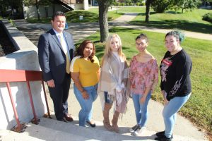Left to right- Michael McCarthy, vice president of administration and finance, with four of the 10 Presidential Scholars Kendra Adan, Jillian Stacy, Mincarys Trinidad Gomez, Neyshkaliz Plaza.