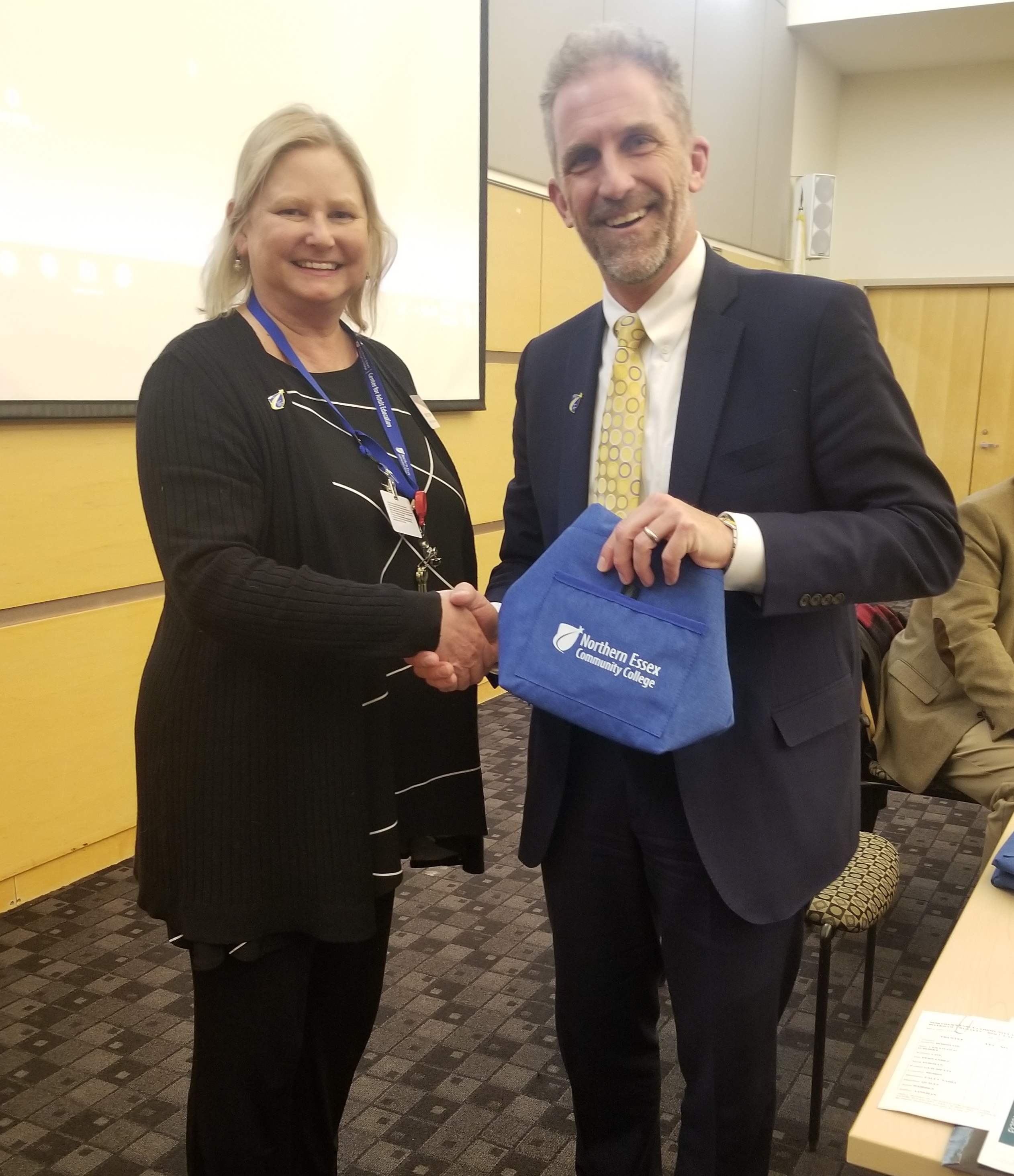 Nancy Sleger, a newly hired instructor for the Essex County Sheriff’s Department inmate education program, attended the February meeting and was the first new employee to be recognized in this way. Glenn invited her to the front of the room where he presented her with Northern Essex swag, including a lapel pin, a case to hold business cards, and an insulated lunch bag.