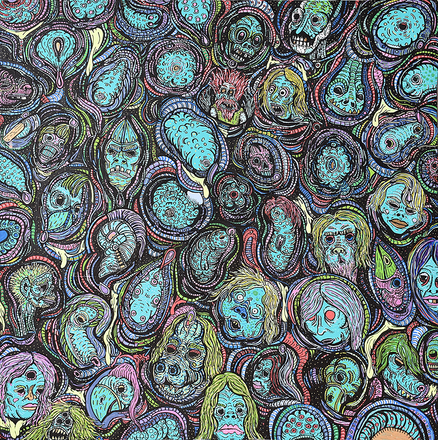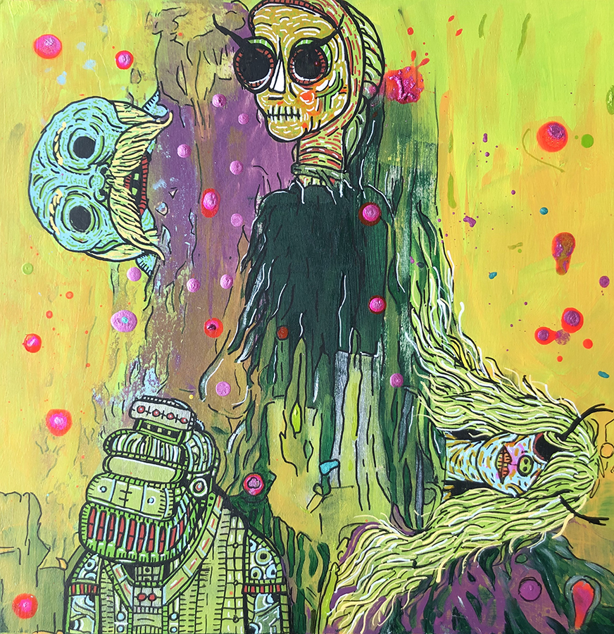 The artist says he uses “surrealism, humor, parody, and grotesque imagery.” “Characters engage in implied, uncertain narratives—struggling for power, facing heartbreak and uncertainty, finding strength to push against oppression, horror, and chronic illness.”