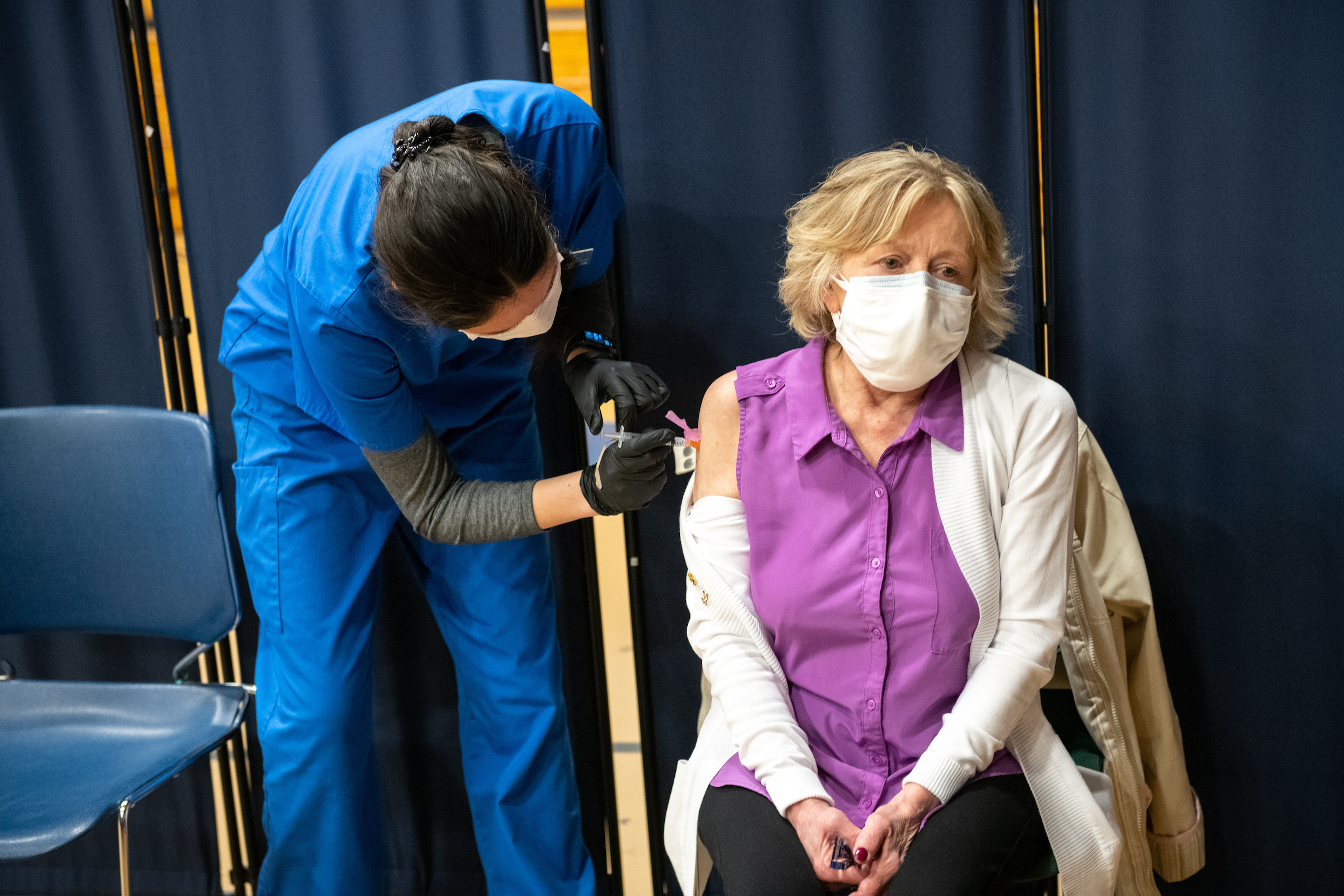 At a vaccine clinic at Arlington Middle School in Lawrence, Medical Assistant Student Jasmine Hong gave Brenda Sicard of Lawrence her vaccine.